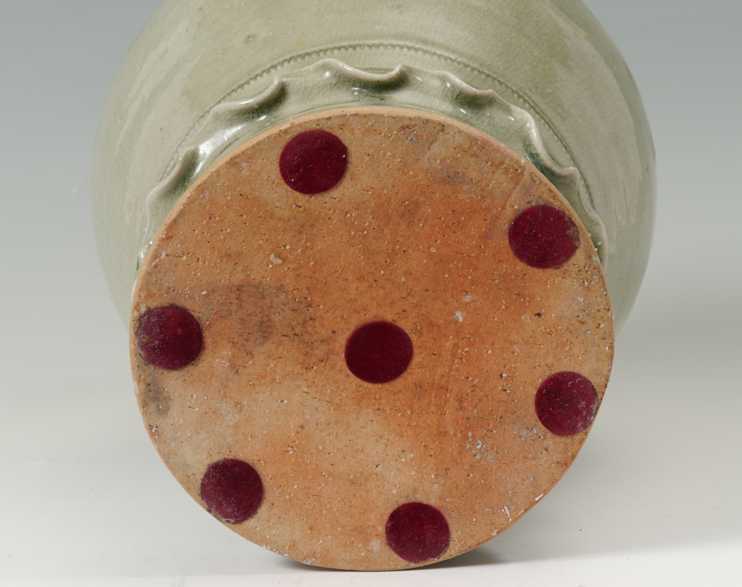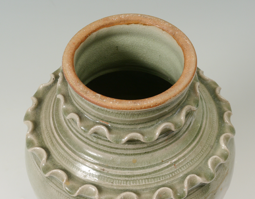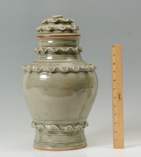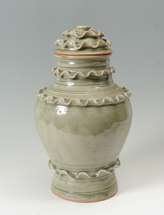 CHINESE CELADON COVERED JAR: Large covered jar with applied ruffle decoration, unmarked. Overall 16''h. x 9''. Actual age unknown.