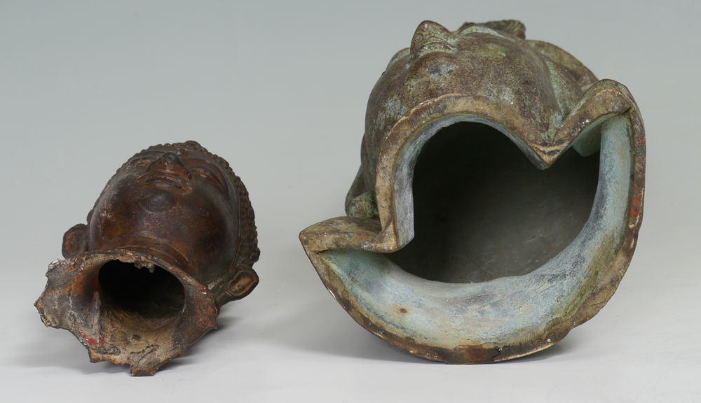 2 BRONZE SOUTHEAST ASIAN BUDDHA BUSTS: 2 pieces total, most likely Thai, to include 1) Figural bust with flowing hair, head band with figural seated Buddha, overall measures 10'' h. x 6'' x 5 1/2''. 2) Smaller bust with head band, hair in bun, stretched ears. 6 3/4'' h. x 3 3/4'' x 4''. Actual age unknown.