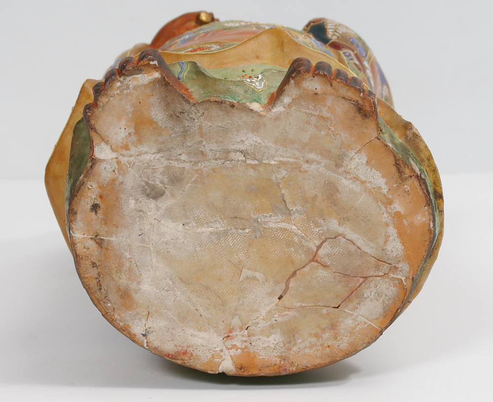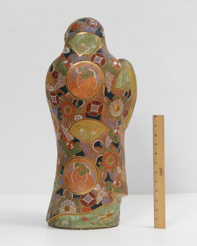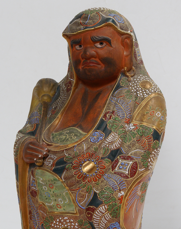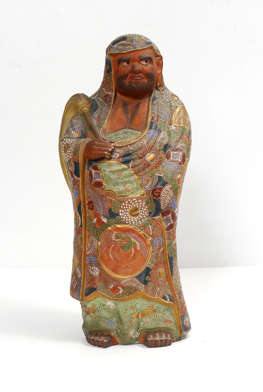 LARGE JAPANESE SATSUMA FIGURE OF A MAN: Satsuma decorated terra cotta figure of a substantial robed man holding a fly brush. Overall measures 22 1/2'' h. x 10 1/2'' x 7 1/2''. Sold with a wood stand, 1 3/4'' x 9 1/2''.