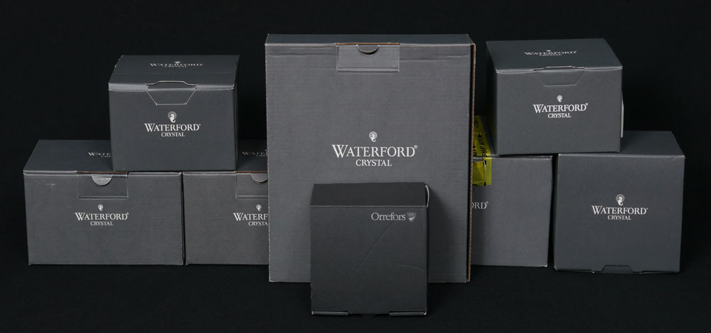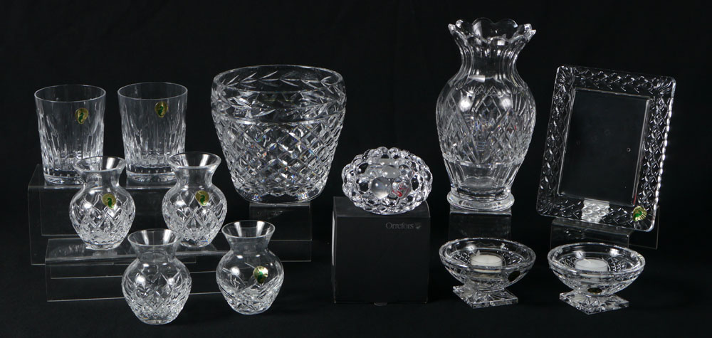 11 PIECE WATERFORD CRYSTAL GIFTWARE: 12 pieces total, 11 Waterford to include 1) Violet vase 2, 4''h., with original box. 2-3) Two Arcade votive candle holders, 4 1/2'' dia., with original boxes. 4-5) Two Violet vase 1, 4 1/8''h., with original boxes. 6) Gemini picture frame, 7 3/4'' x 6 1/4'', 7-8) 2 Millennium Love double old fashioned glasses, 4 3/8''h., with original box. 9) Baluster form vase, 9''h. 10) Center bowl, 7'' dia. 11) Small vase 4''h. And sold with # 12) Orrefors Raspberry votive, 4'' dia., with original box.
