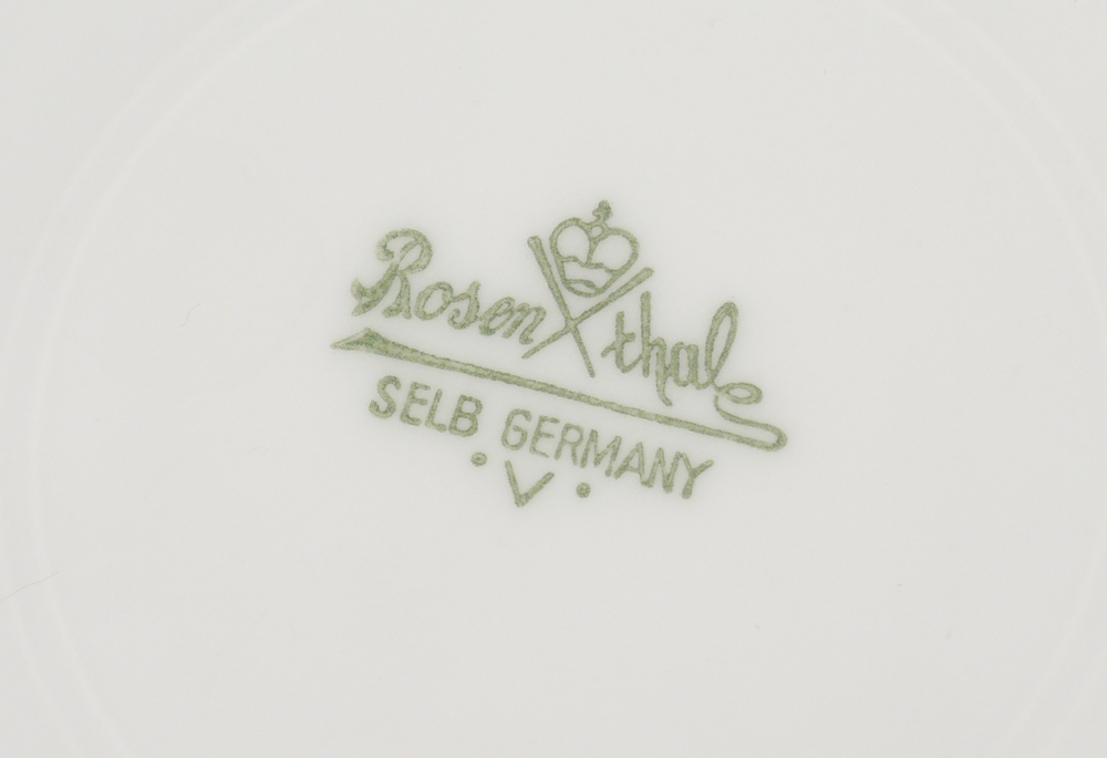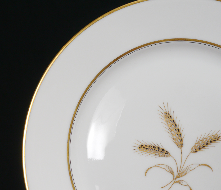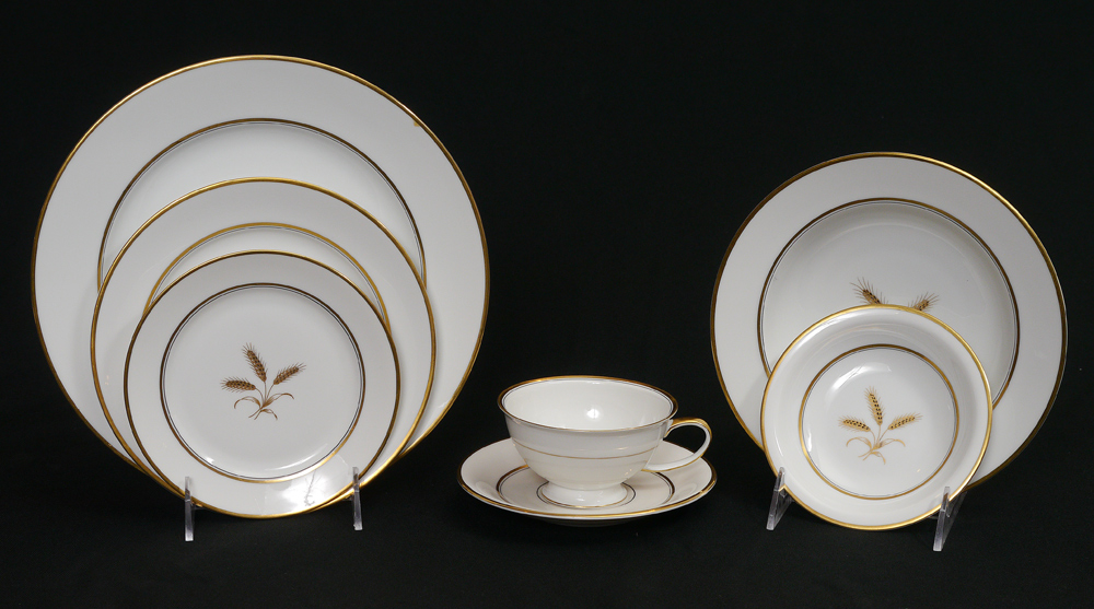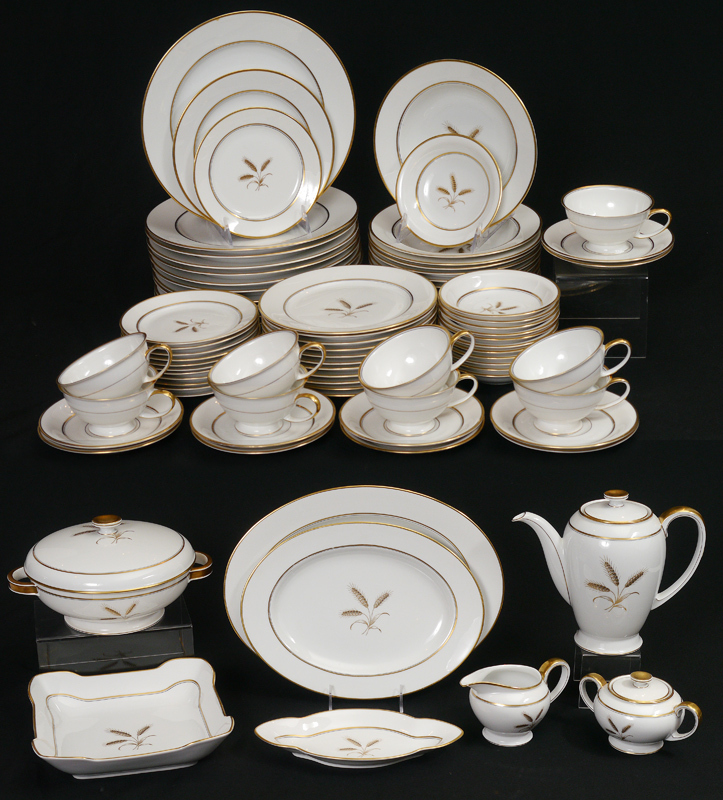 ROSENTHAL ''BOUNTIFUL'' DINNER SERVICE & GLASSES: Approx. 90 pieces in the Bountiful pattern by Rosenthal to include 12 dinner plates (10''), 12 salad plates (7 1/2''), 12 bread plates (6''), 12 soup bowls (8''), 12 dessert bowls (5 1/4''), 9 teacups, 12 saucers, 2 oval platters (largest 11'' x 14 3/4''), covered vegetable (5 1/2'' x 10 3/4''), square open vegetable, gravy boat, relish, coffee pot, open creamer, covered sugar. Sold with Rosenthal Wheat pattern stemware to include 12 water glasses (5 5/8'' h.) and 9 wine (4'' h.)