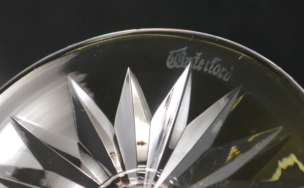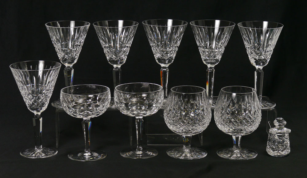 10 PIECE WATERFORD STEMS INCLUDING MAEVE: 11 pieces total to include 1-6) 6 Claret wines in the Maeve pattern, 6 1/2'' h. 7-8) 2 brandy glasses, 5 1/8''. 9-10) 2 margarita glasses, 5 1/4''. 11) Salt jar with spoon, 2 7/8'' h.