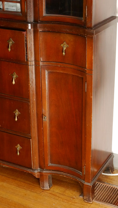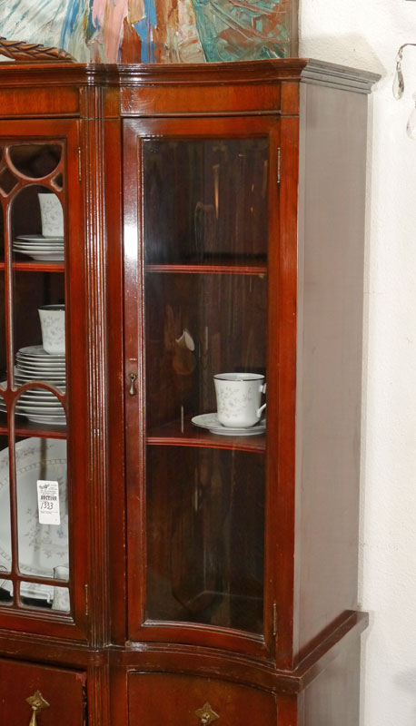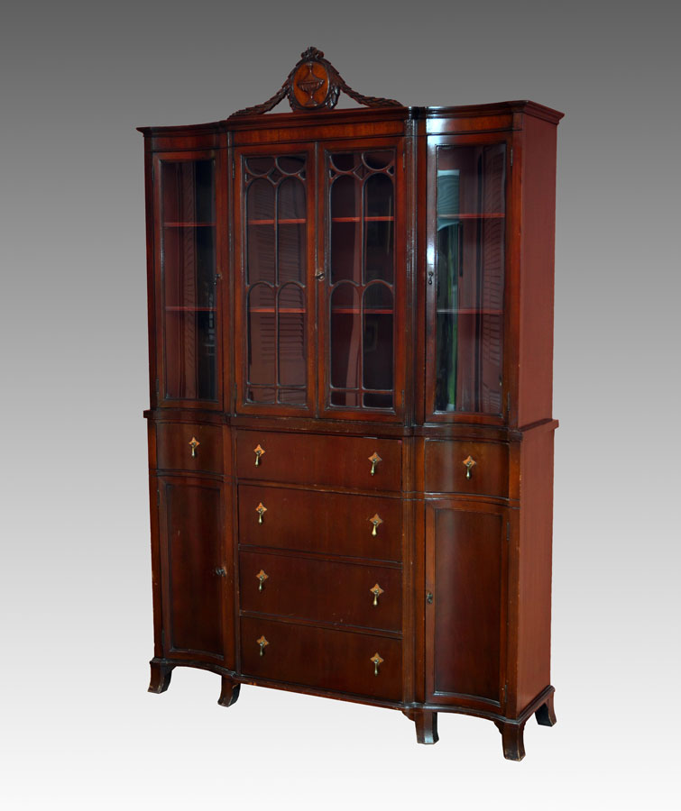 MAHOGANY CHINA CABINET: Carved wreath crest, central medallion with applied urn decoration. 2 central glass doors with fretwork, shaped glass side doors. Base with 4 central drawers, shaped sides with single drawer over door. 79 1/4'' h. x 50'' x 15''.
