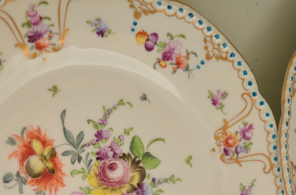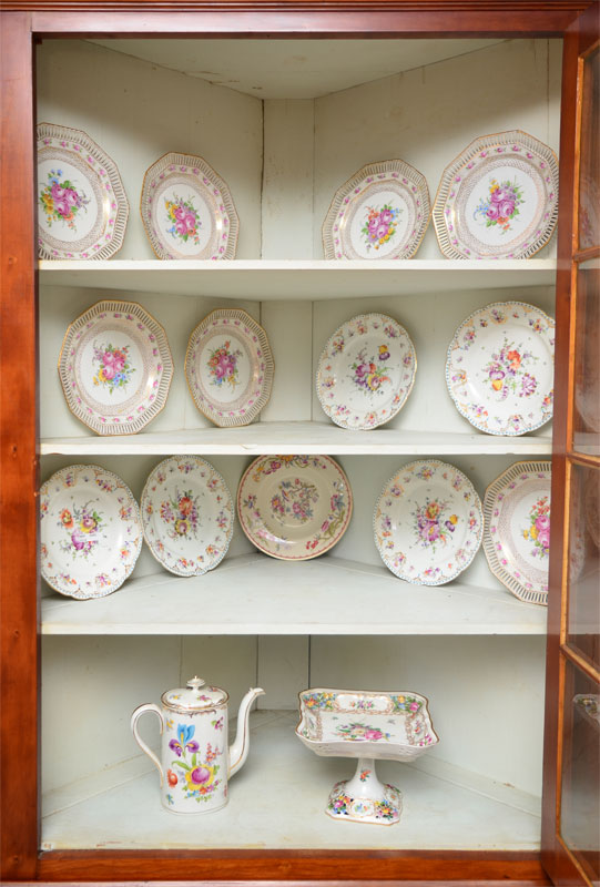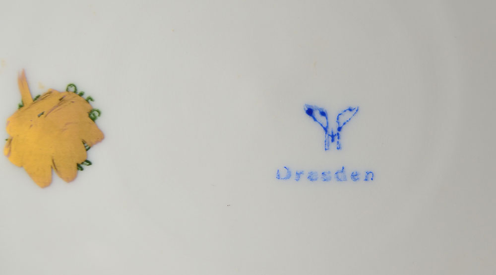 HAND PAINTED DRESDEN CHINA 14 PC: An assembled collection of hand painted floral motif china by assorted makers to include 7 Franziska Hirsch plates with reticulated rim 9'' dia, 5 Franziska Hirsch plates with scalloped rims 8 3/4'', Carl Thieme footed square compote with reticulated corners 5 3/4'' h. x 8 1/4'', and unidentified RL mark coffee pot 8'' h. x 8 3/4''.