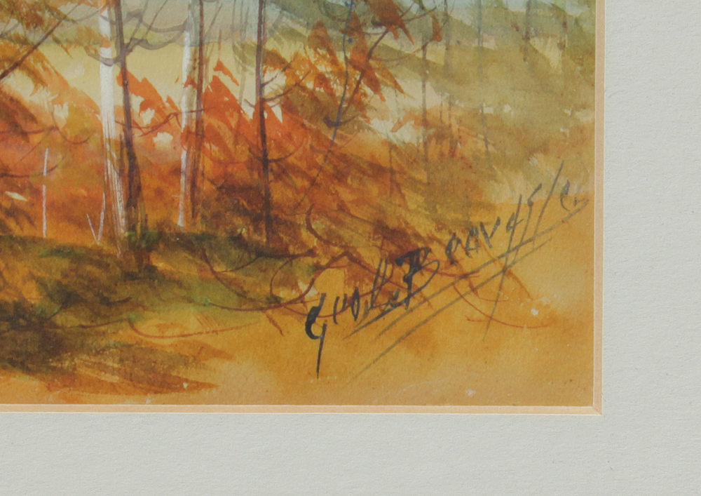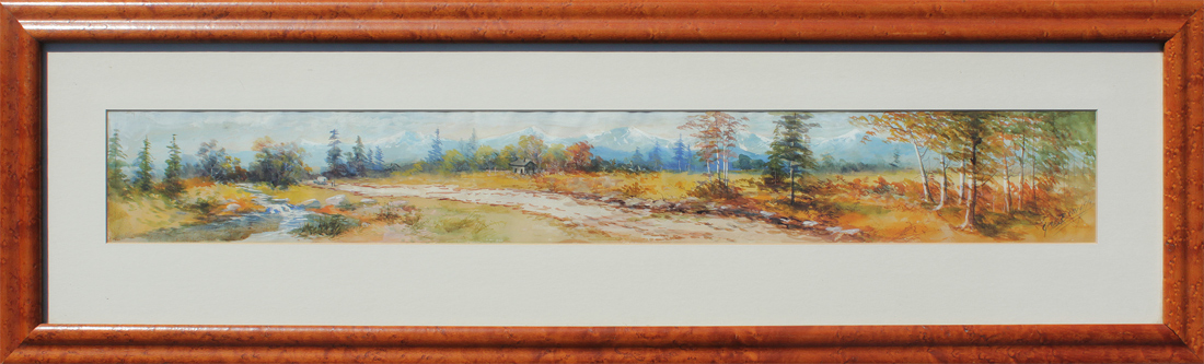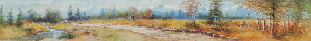 BEARDSLEY, George O., (American, 1867-1938): Panoramic Western Scene with snow capped mountains in the distance and stream, Watercolor, sight size 5'' x 34 1/2'', signed lower right, framed, 13'' x 42 1/2''.