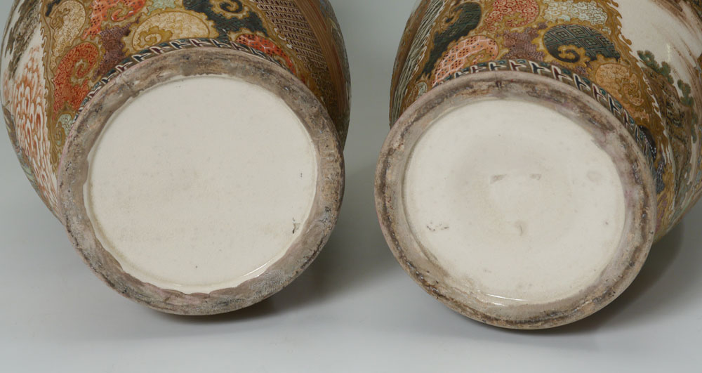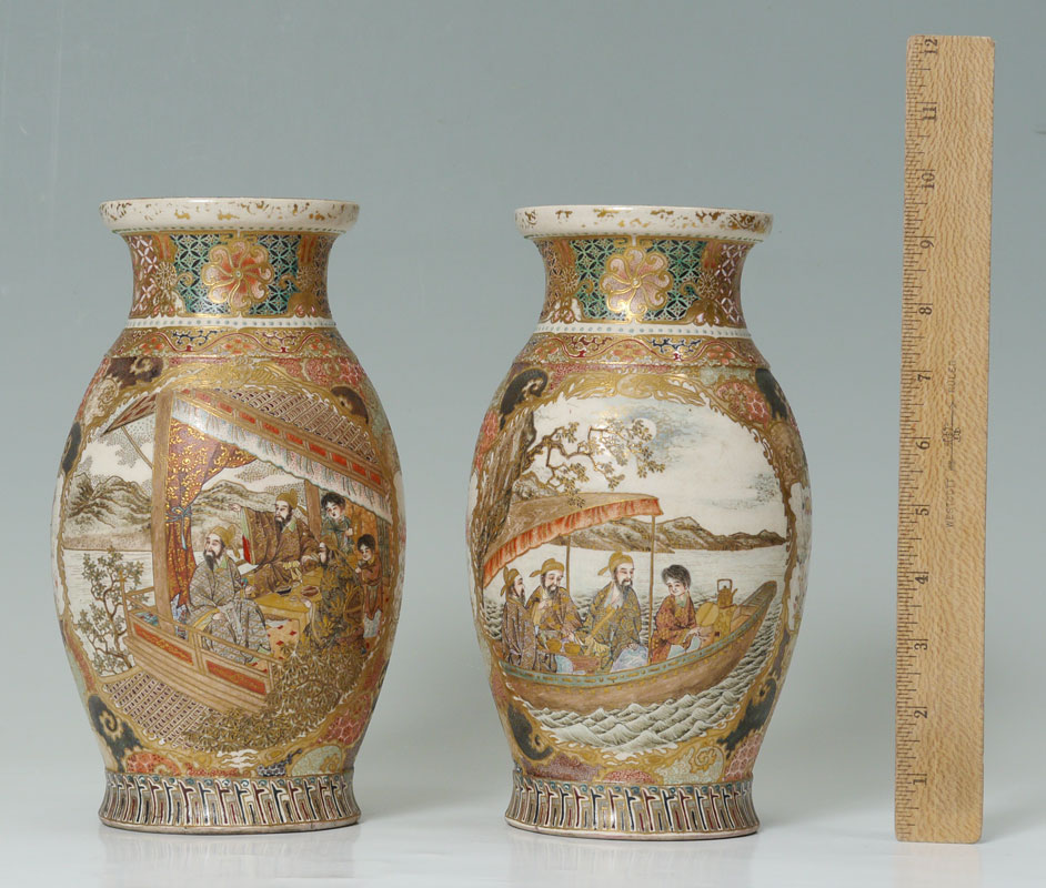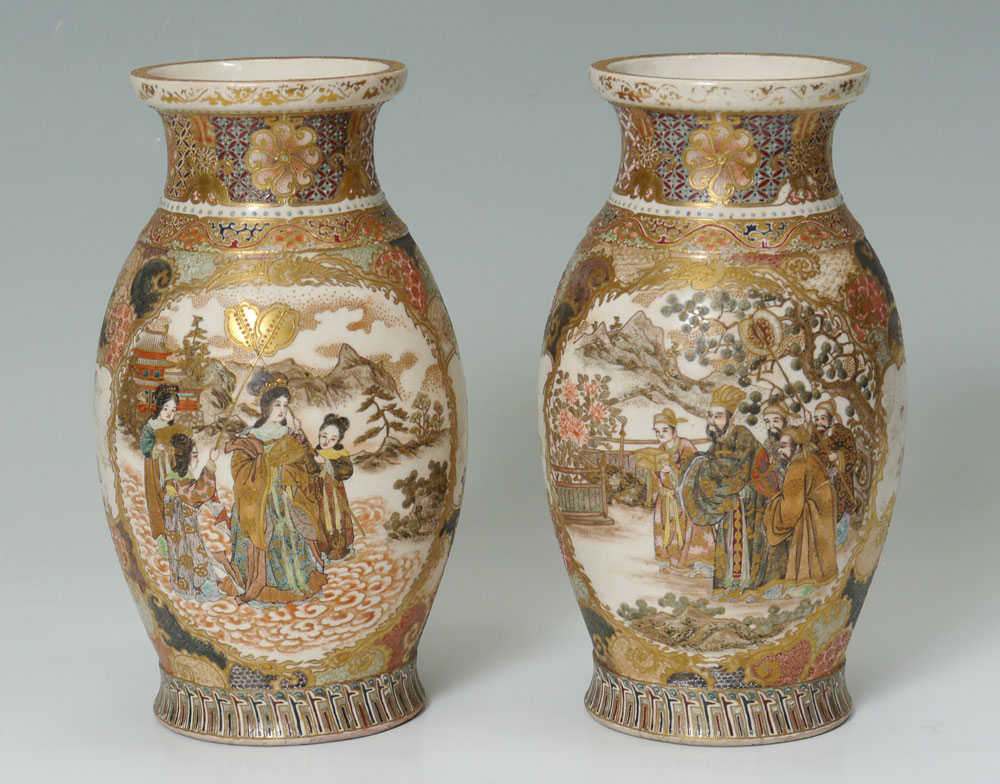 PAIR OF JAPANESE SATSUMA VASES: Decorated with outdoor genre scenes and foliate motifs, unmarked. Measure 9 1/2'' h. x 5 1/4'' dia.