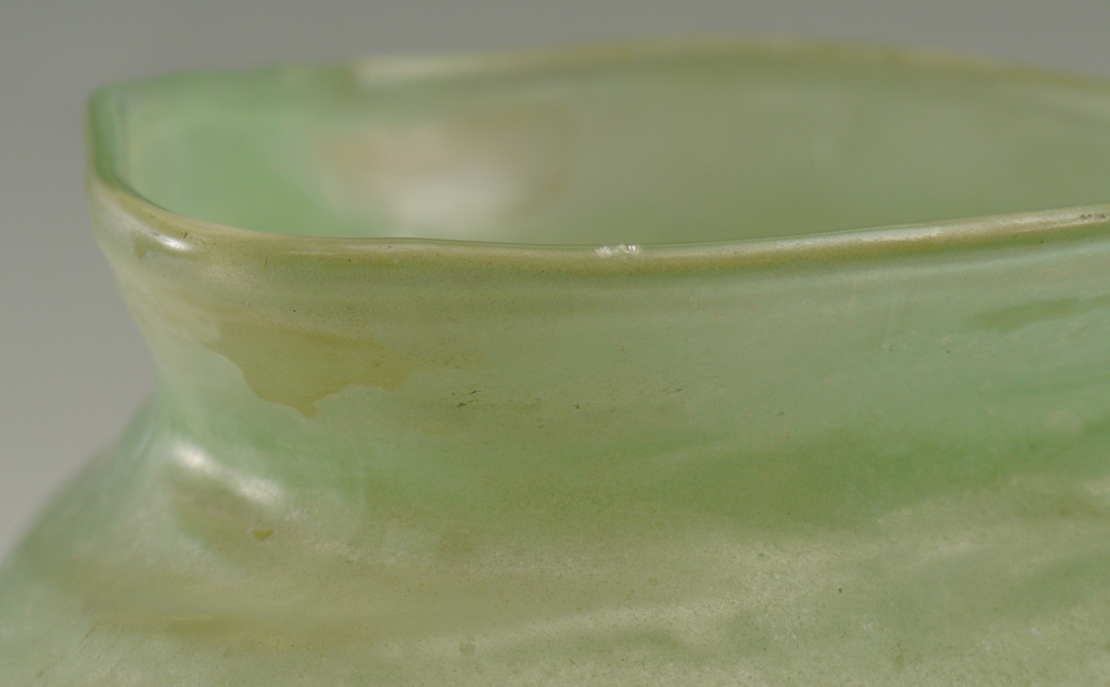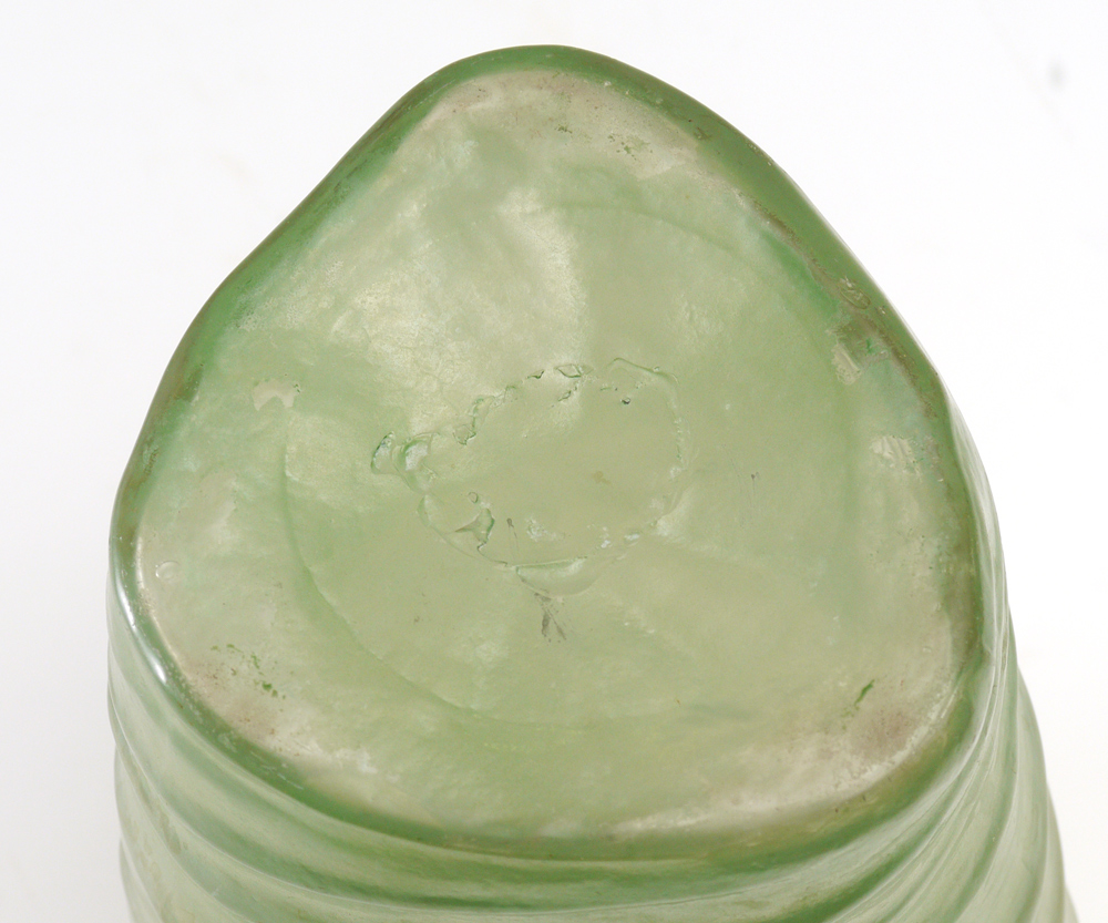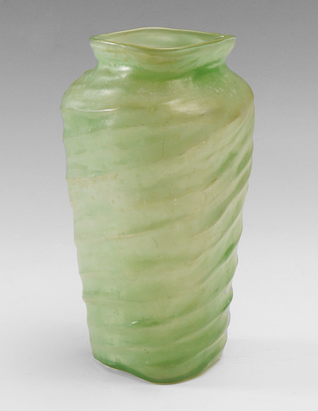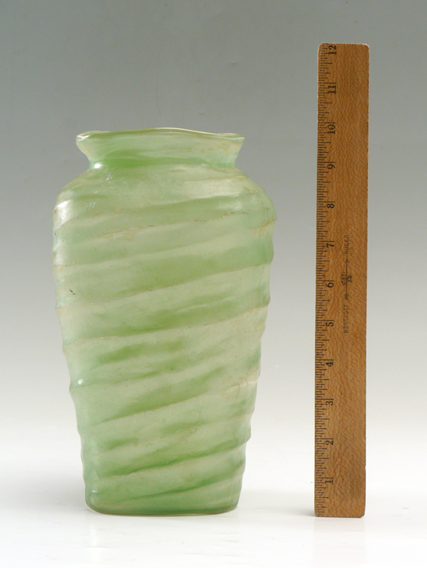 BOHEMIAN ART GLASS VASE: 3 sided vase with frosted seafoam green glass, ribbed sides. No visible markings, 9 3/4'' h. x 6'' x 6''.