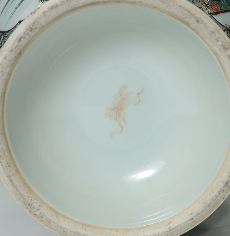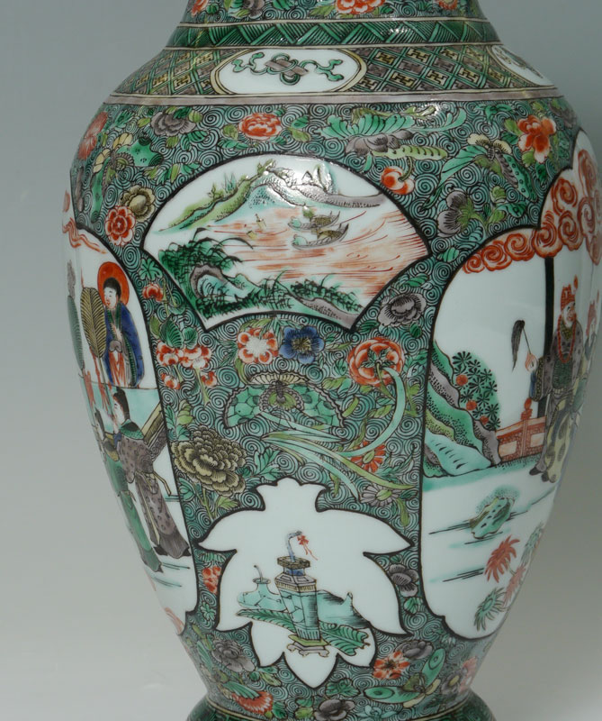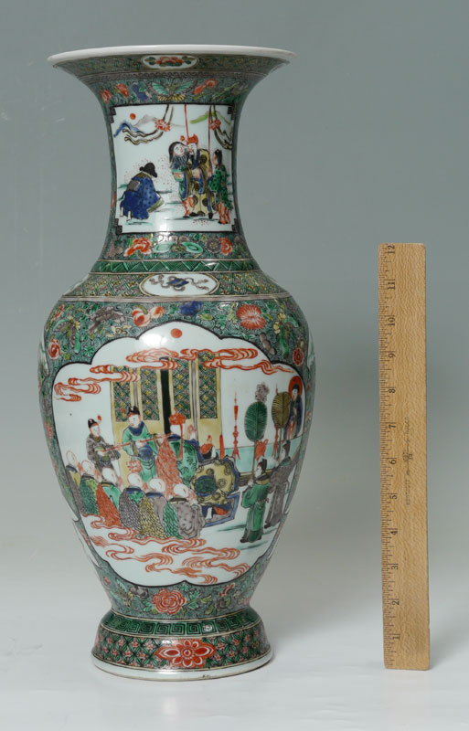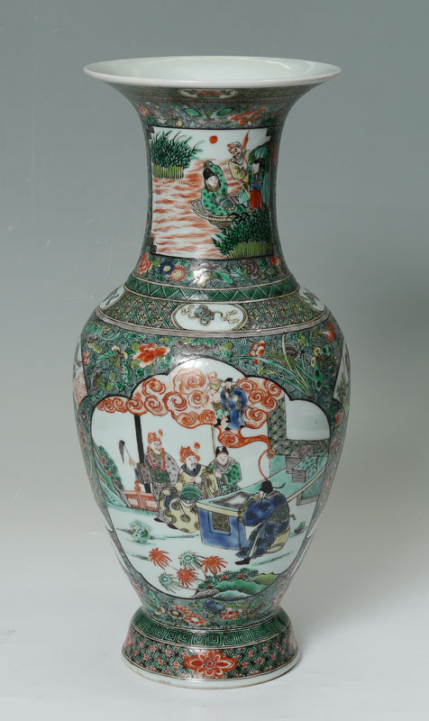 ORIENTAL FAMILLE VERDE VASE: Baluster form vase with typical outdoor genre scenes in reserves. Marked on base with a unknown wrapped leaf red underglaze mark. Measures 17 1/2'' h. x 7 1/2'' dia.