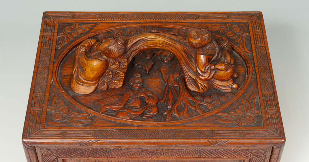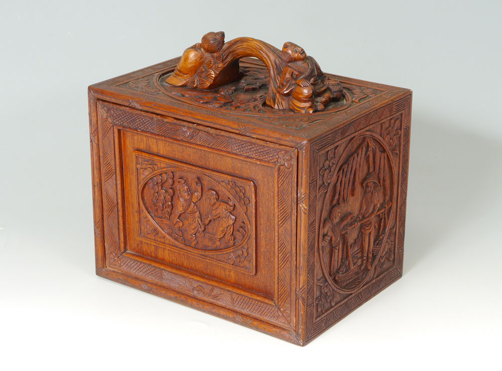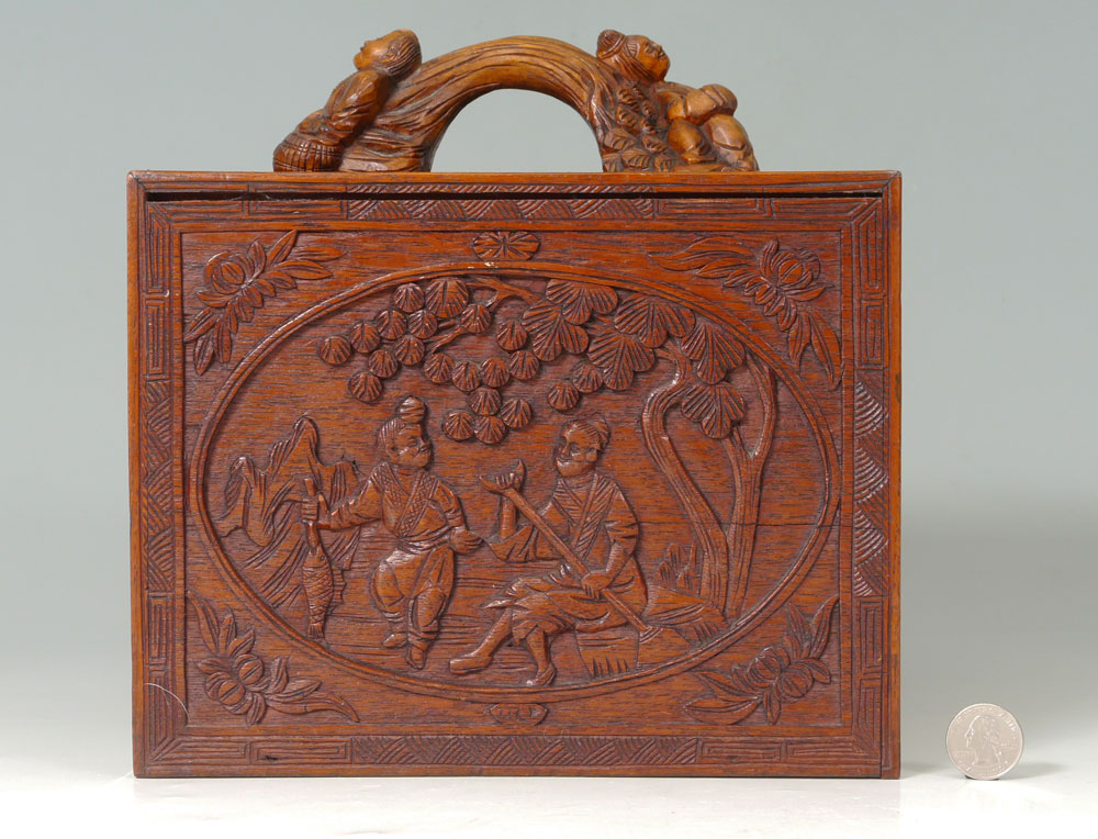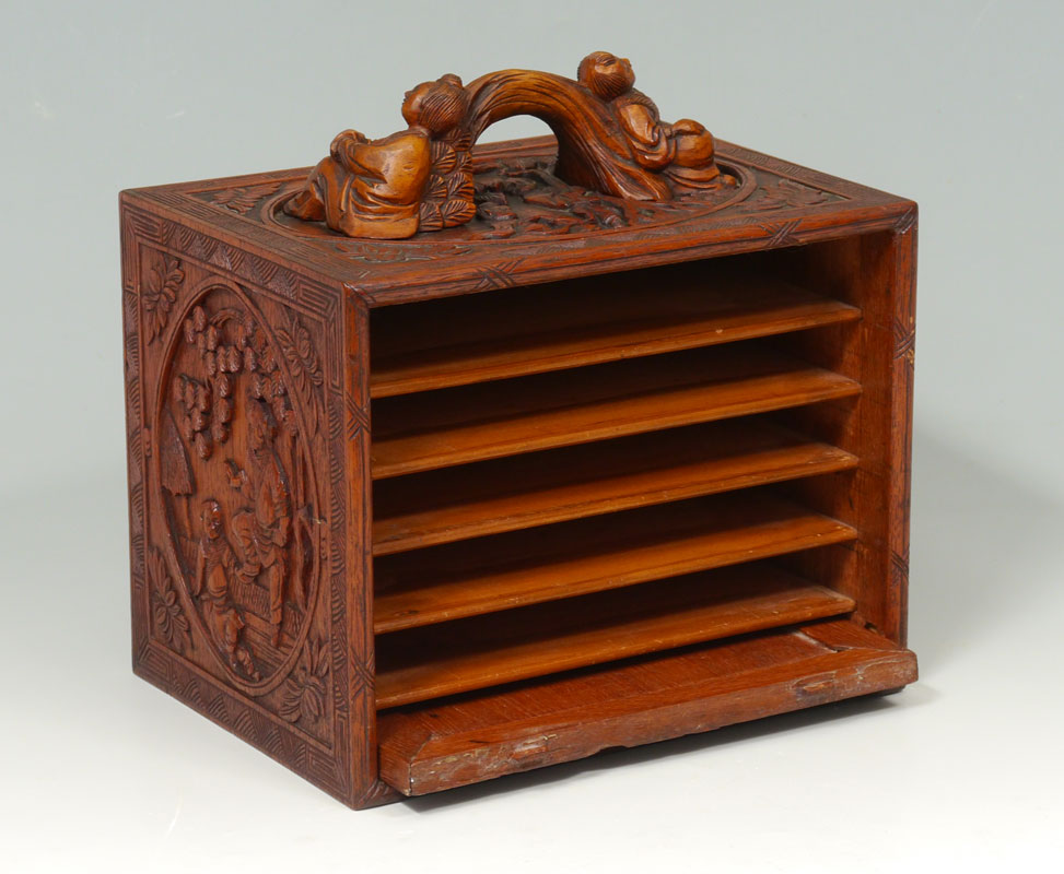 CARVED CHINESE SCHOLARS BOX: Carved all over, handle with 2 figures resting, sides with outdoor genre scenes, 5 internal shelves. Overall measures 9'' h. x 9 1/2'' x 7''.
