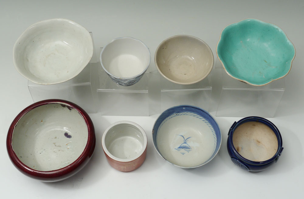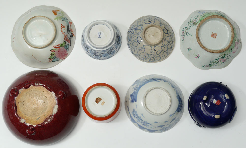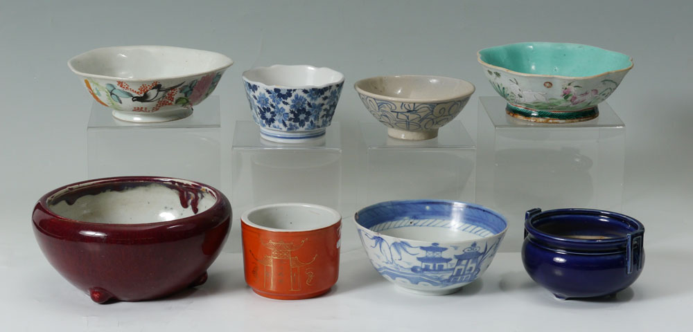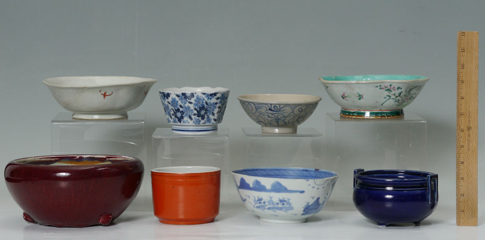 8 PIECE ORIENTAL PORCELAIN BOWL COLLECTION: An assembled collection of Chinese, Japanese and possible other bowls and vessels to include blue decorated, oxblood glaze, blue glaze, polychrome and more. Largest oxblood vessel measures 4'' h. x 9'' dia.