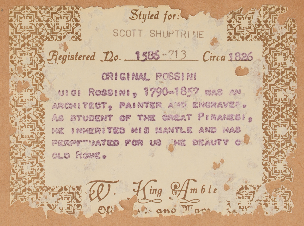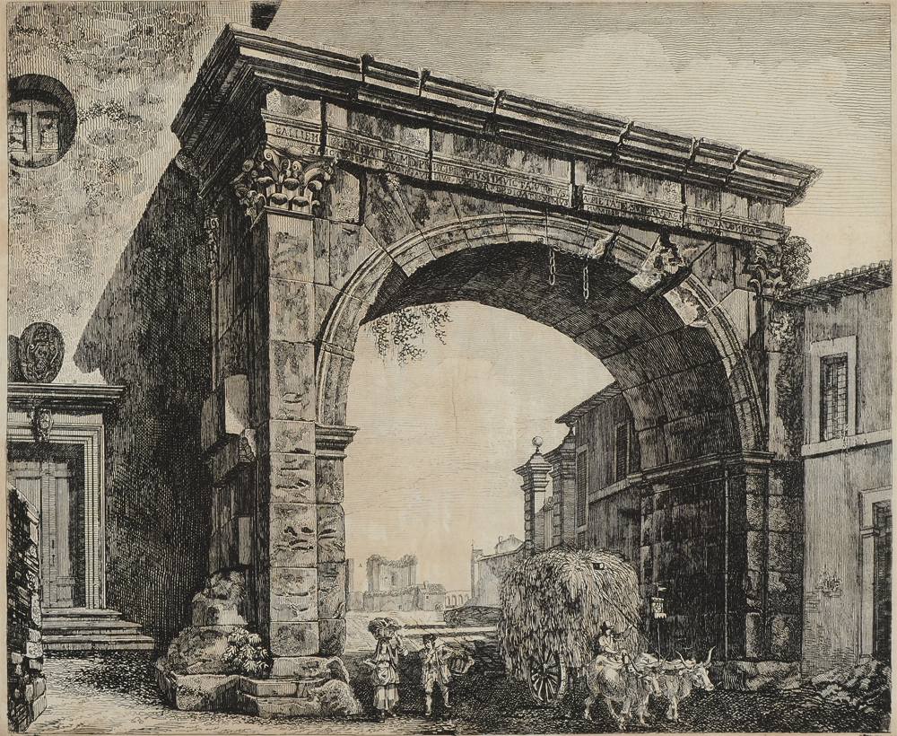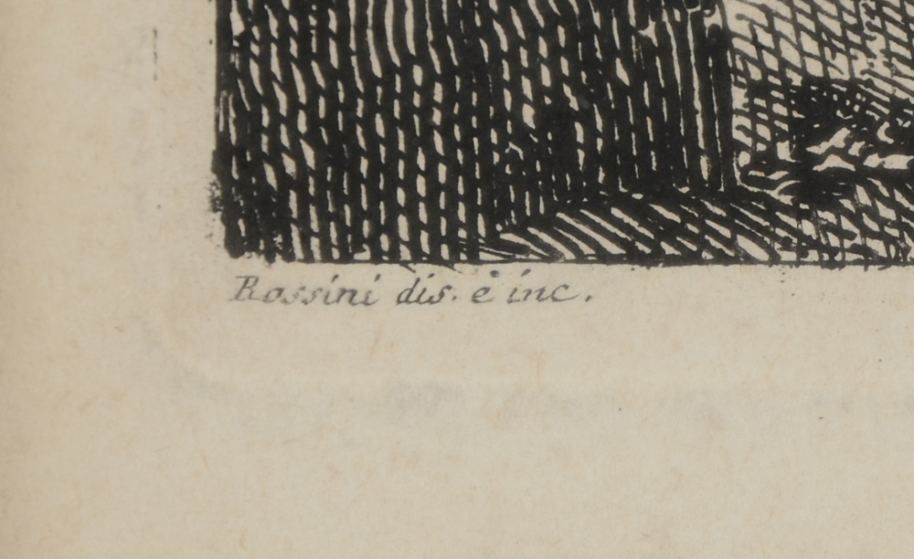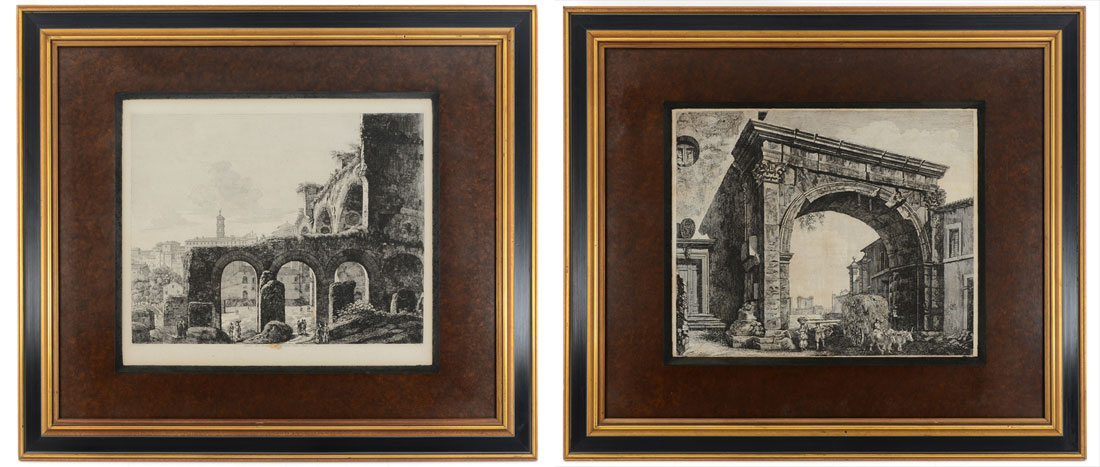 ROSSINI, Luigi, (Italian, 1790-1857): 2 piece engraving lot, 1) Landscape with Triple Archway, Avanzi del Portice del Tempio, del la Pace, Engraving, sight size 16'' x 18 3/4'', fine custom framing, 27 1/2'' x 31 1/2''. 2) Archway, Engraving, sight size 15'' x 18 1/2'', fine custom framing, 27 1/2'' x 31 1/2''. Sold as a lot.