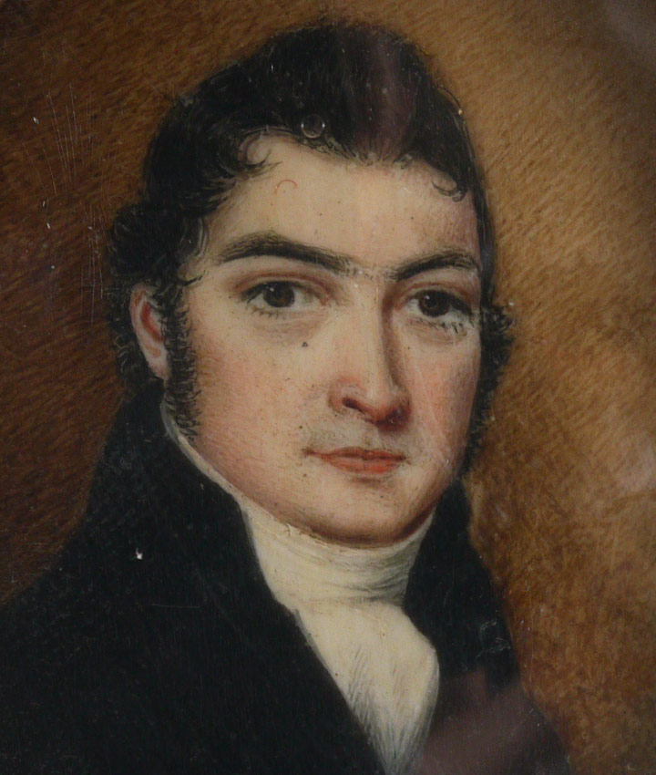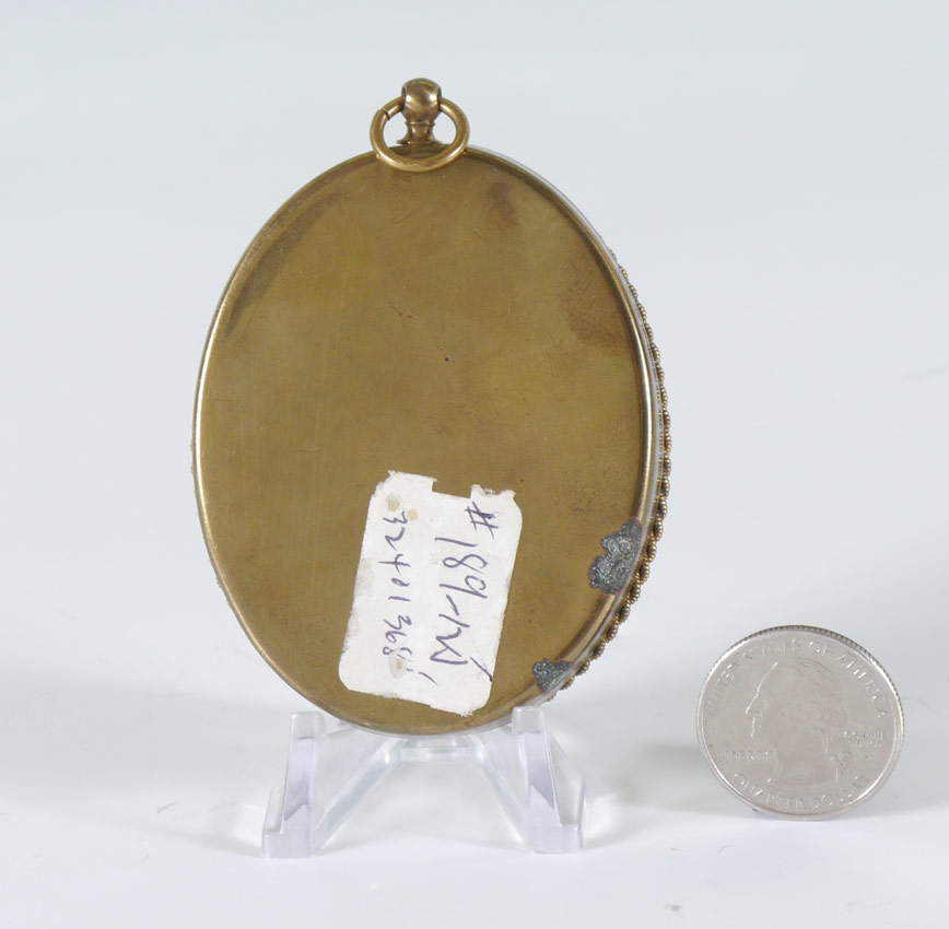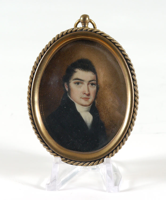 19th CENTURY MINIATURE PORTRAIT PAINTING OF A DISTINGUISHED YOUNG GENTLEMAN: Oval 2 1/2'' x 2'', encased in a gold wash metal frame with rope boarder 2 3/4'' x 2 1/4''.