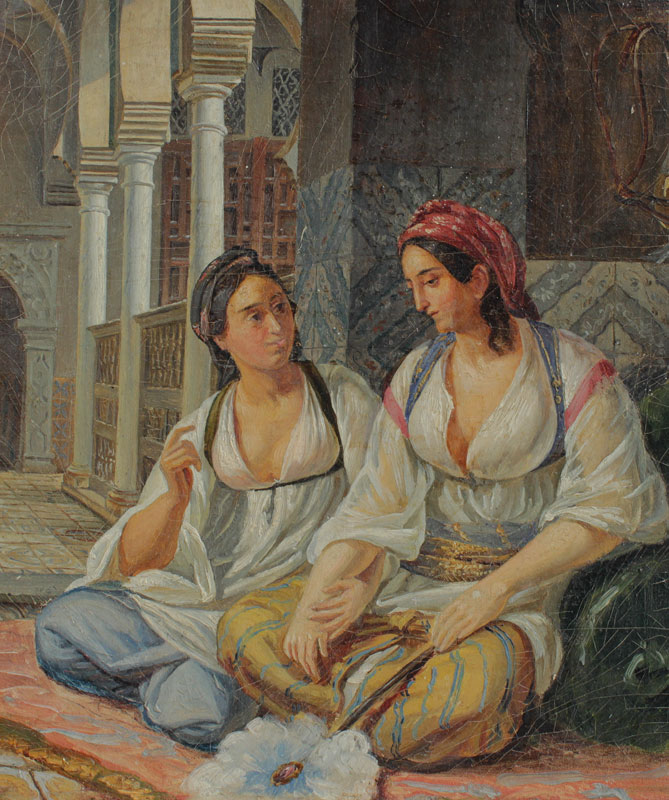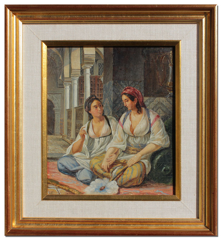 ORIENTALIST HAREM INTERIOR PAINTING: Scene Depicts Two Young Girls in Conversation, Oil/Canvas Mounted to Board, 8 1/2'' x 7 1/2'', no visible signature, contemporary frame 12 1/2'' x 11 1/2''.