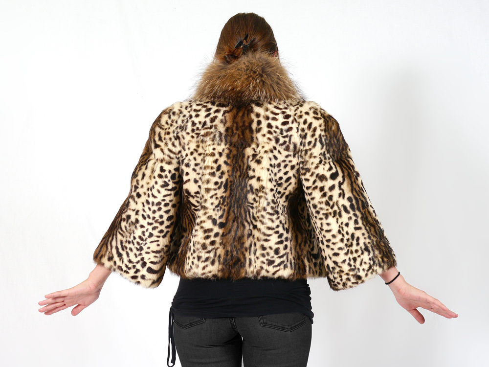 ADRIENNE LANDAU LEOPARD PRINT RABBIT FUR JACKET: With raccoon collar. Off set button, slit pockets. Size Medium, measures approx. 20'' collar to hem, 18'' sleeve, 18'' shoulder to shoulder.