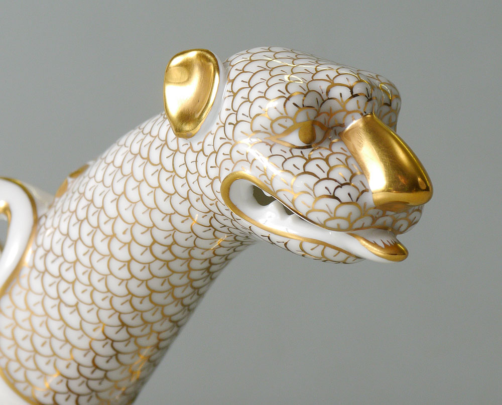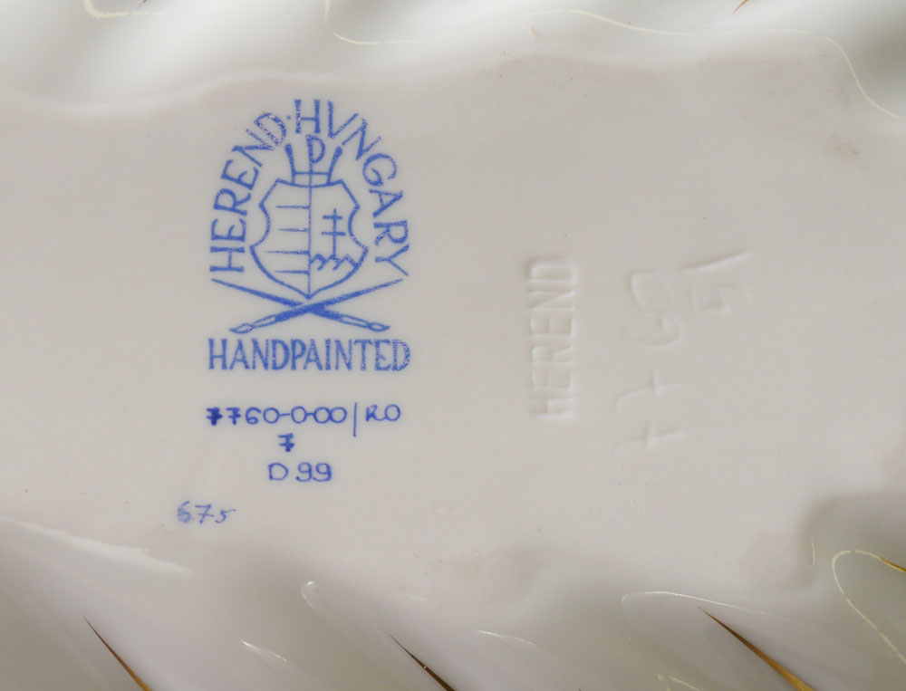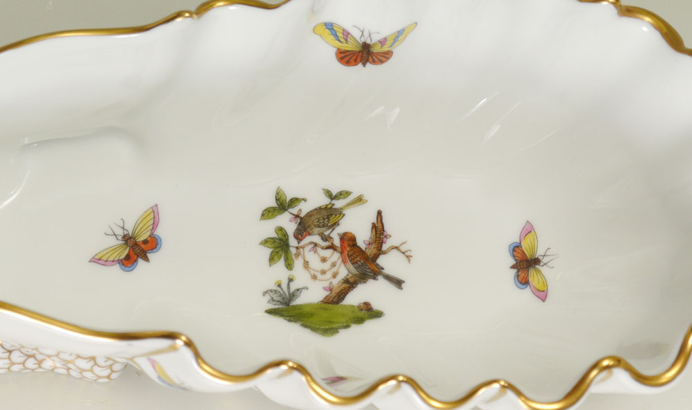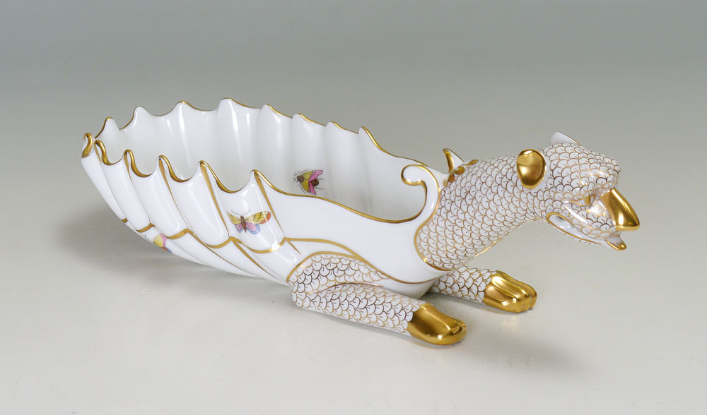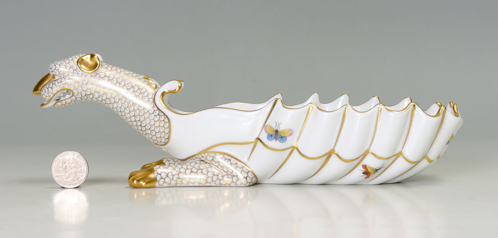 HEREND PORCELAIN DRAGON DISH: Fish scale and butterfly decoration to the exterior. Bird, flower, and butterfly in the interior. Measures approx. 11'' length x 3'' high.