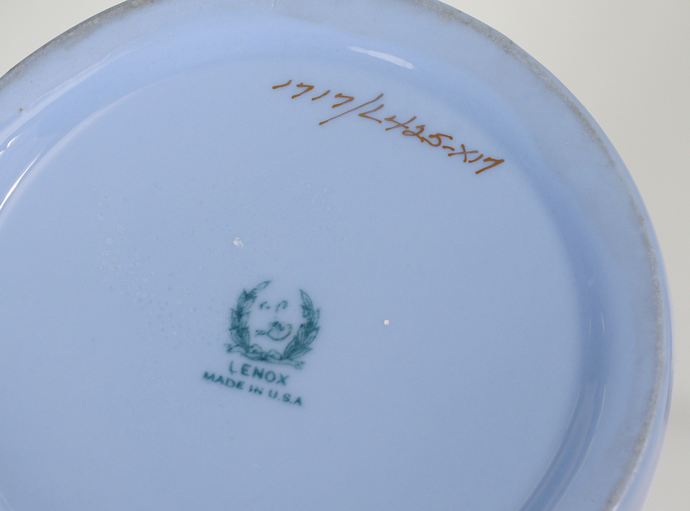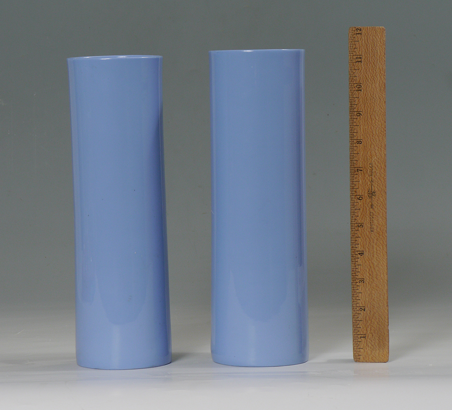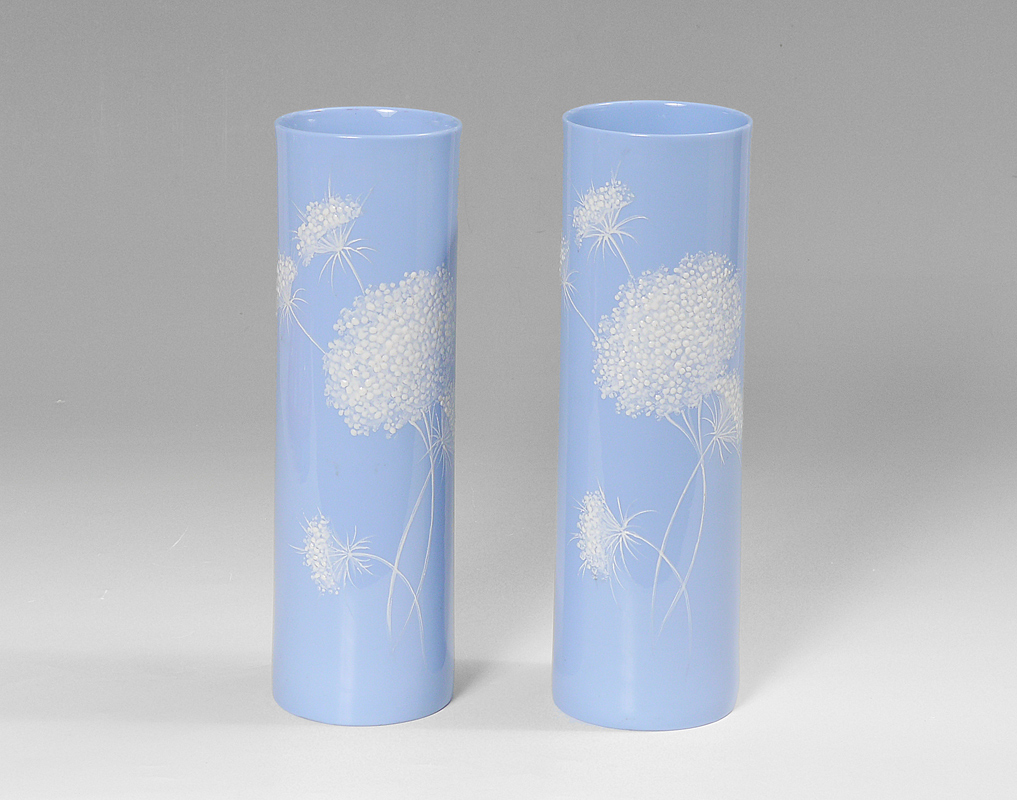 PAIR LENOX TALL VASES: Blue cylindrical vases with white floral decoration. Marked on base, 11 1/2'' h. x 3 1/2''.