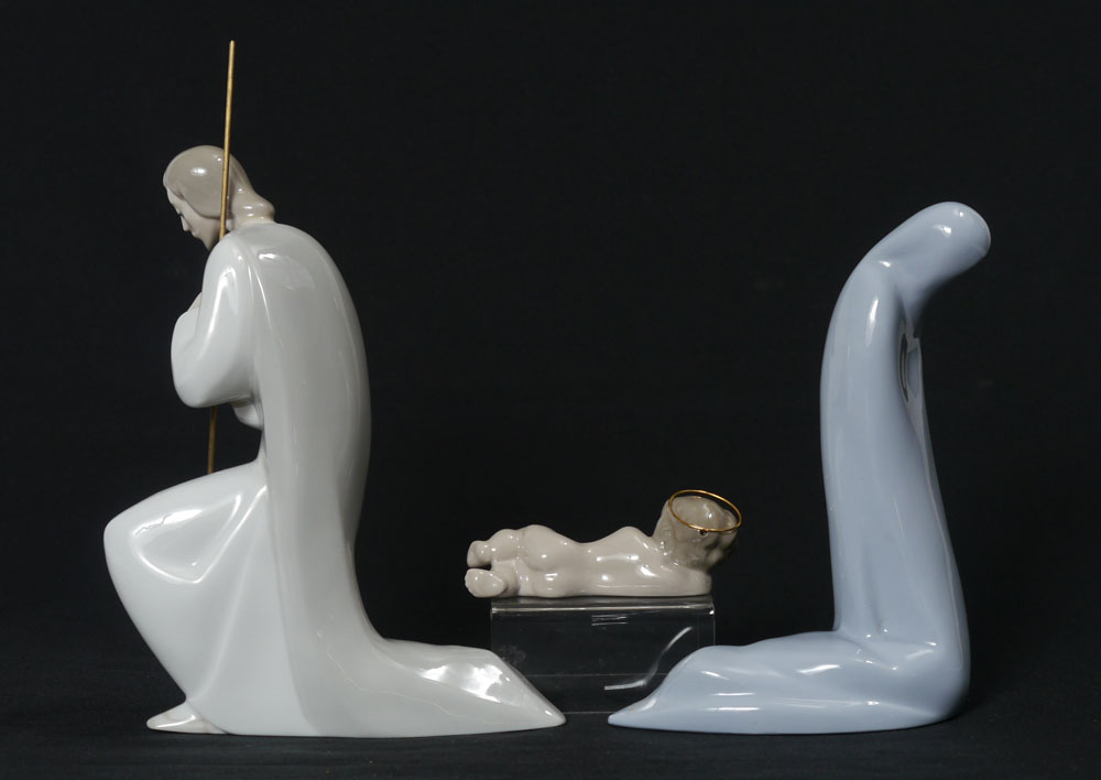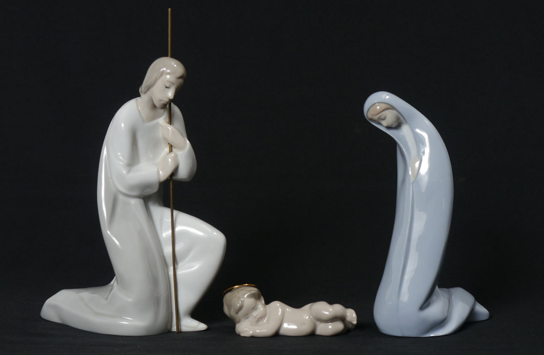 LLADRO PORCELAIN FIGURINES: The Holy Family by Fulgencio Garcia; 1)SAINT JOSEPH #4533, issued 1969 active, 9.25''h. x 5.50''. 2)MADONNA (MARY) #4534, issued 1969 active, 7.25'' x 5.25''. 3)BABY JESUS #4535, issued 1969 active, 1.25'' x 3.50''. Sold as a lot.