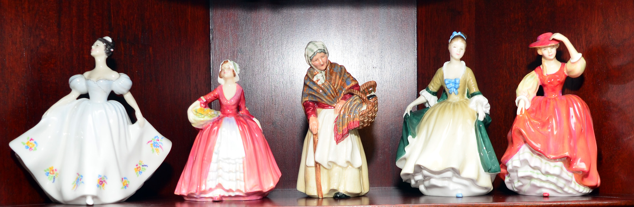 5 PIECE ROYAL DOULTON FIGURINES: 5 piece total to include 1) ''Buttercup'', HN 2399, 7 1/4'' h. 2) ''Kate'', HN 2789, 7 3/8'' h. 3) ''Elegance'', HN 2264, 7 1/2''h. 4) ''Janet'', HN 1534, 6 1/4''. 5) ''Grandma'', HN 2052, 7'' h.