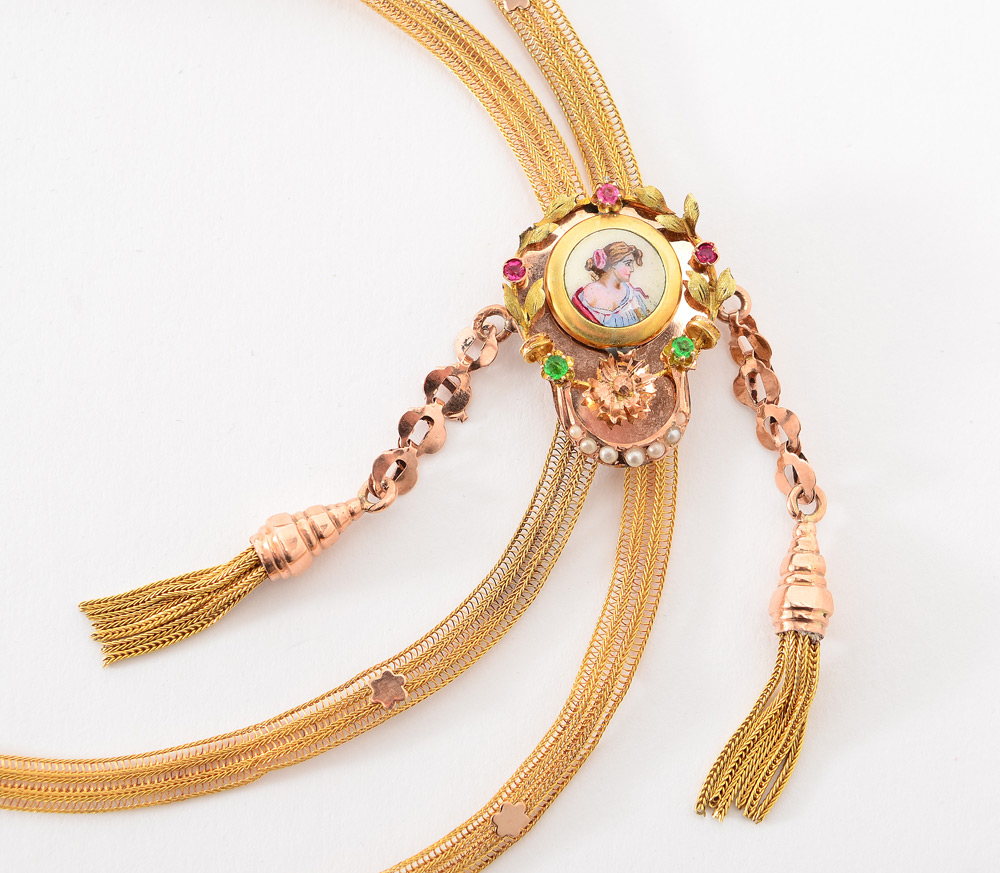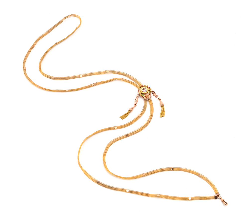 VICTORIAN GOLD MESH, 60'' CHAIN WITH TASSEL SLIDE: 14K yellow gold mesh chain with enameled slide embellished with rubies, emeralds and seed pearls. The chain measures approx. 60'' and is fitted with a watch clasp. Weight approx. 26.1 grams.