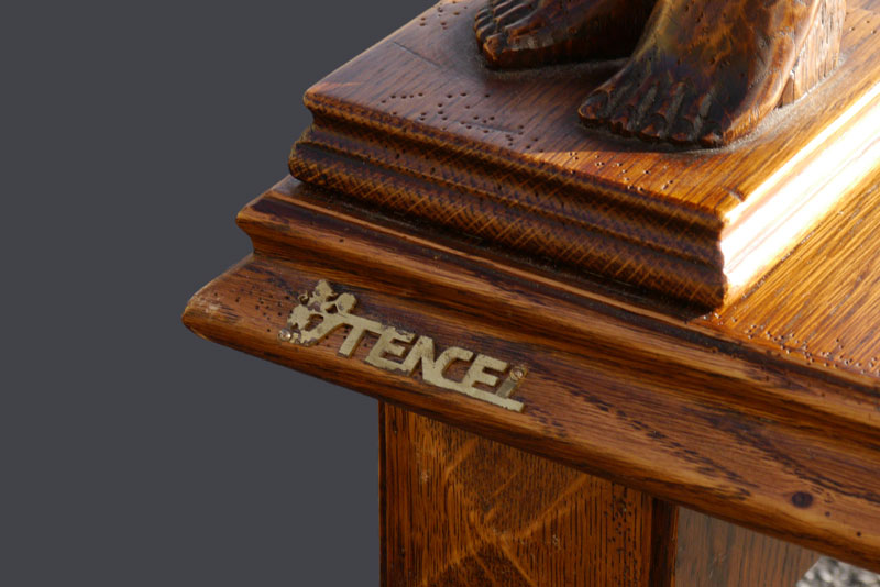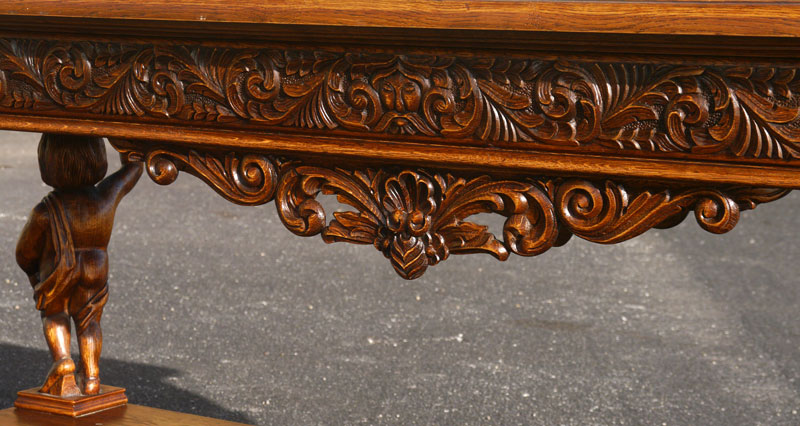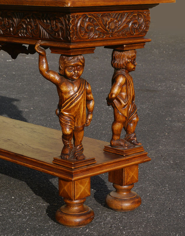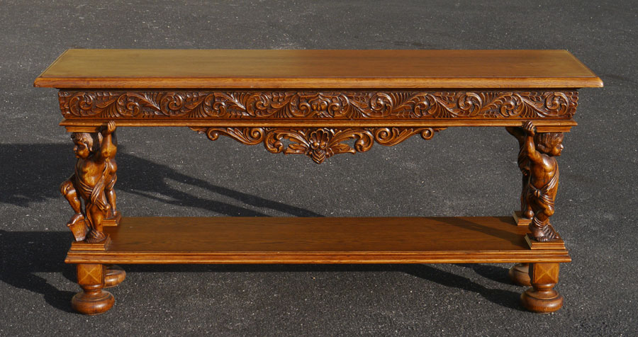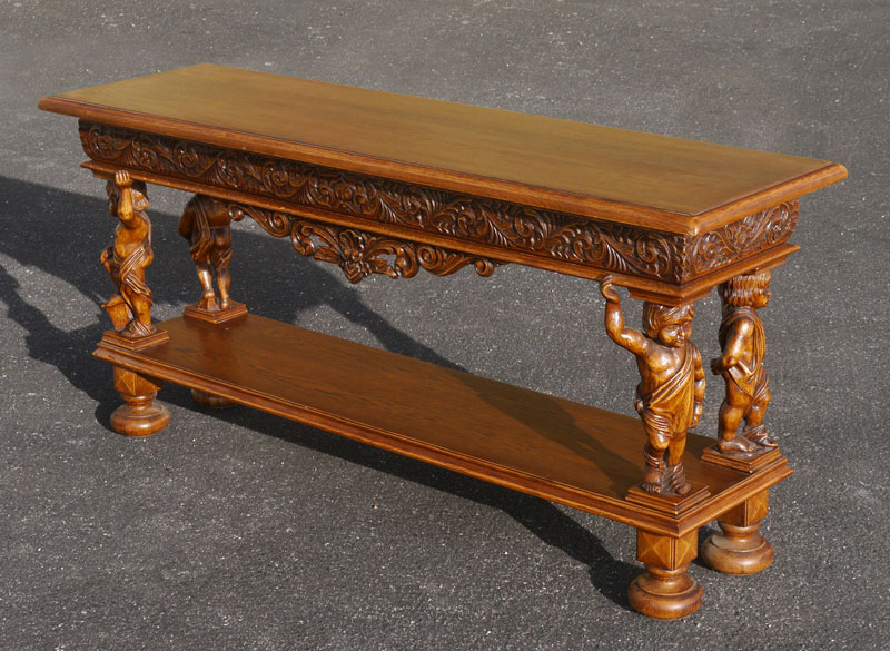 STENCEL FIGURAL CARVED OAK SOFA OR FOYER TABLE: Carved apron with floral and foliate motifs over figural putti caryatid supports, lower open shelf, bun feet. Measures 31'' h. x 67'' x 19 1/2''.