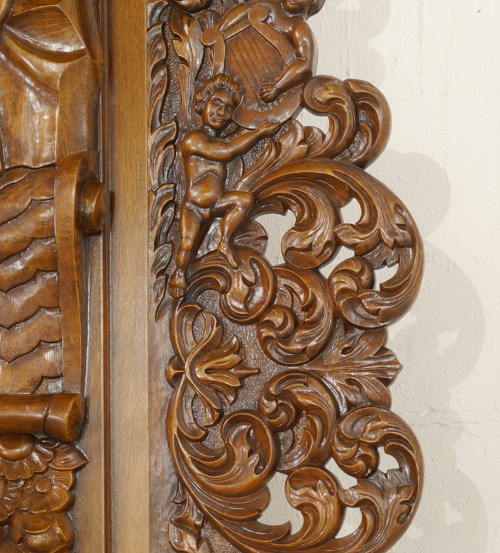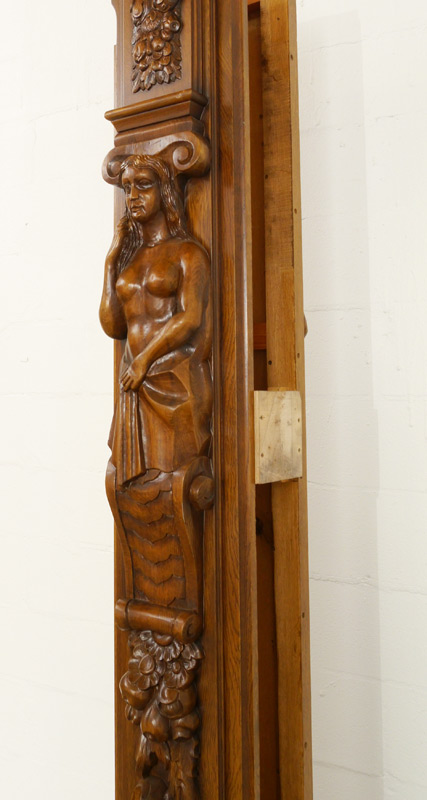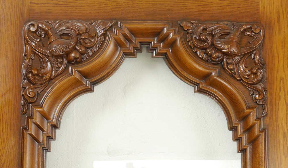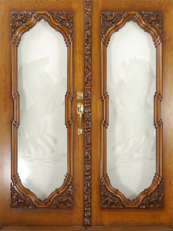 A GRAND CARVED AND ETCHED FRENCH DOORS ENTRYWAY: Heavily carved all over to include 4 urn finials over lentil with Northwind masquerons. Frame with figural bust, foliate decoration. Removable side panels with foliate and putti figures. Each door with carved bezel, mirror image etched glass dancing horses. Overall approx. 116'' h. x 116'' wide, each door 91 1/2'' h. x 38''.
