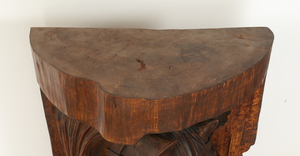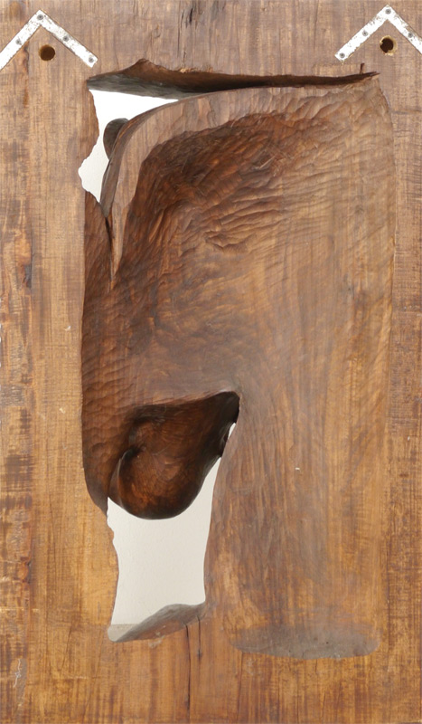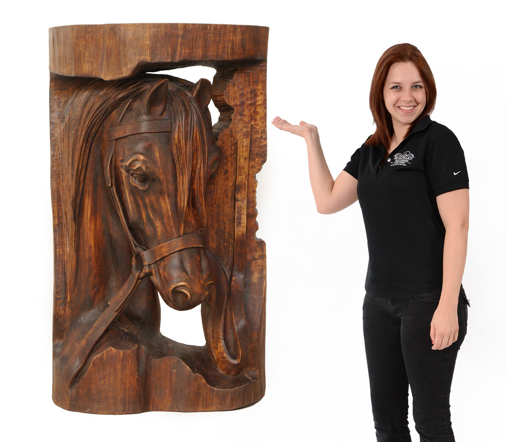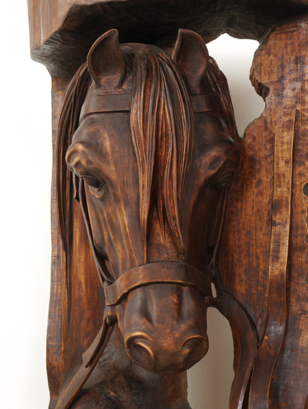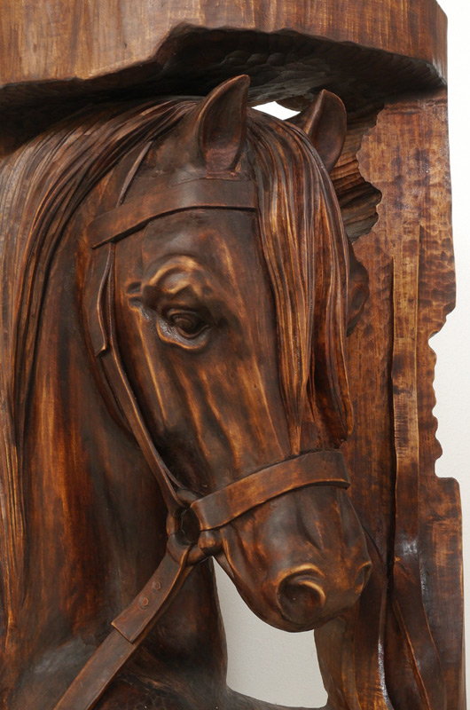 45'' CARVED WOOD HORSE WALL SCULPTURE: Nicely detailed carving of a horse bust with bridle, carved from a single log. Unsigned, overall measures 45 1/2'' h. x 29 1/2'' x 15 1/4''. Weighs approximately 108.5 lbs.