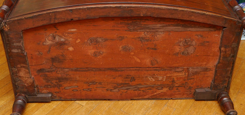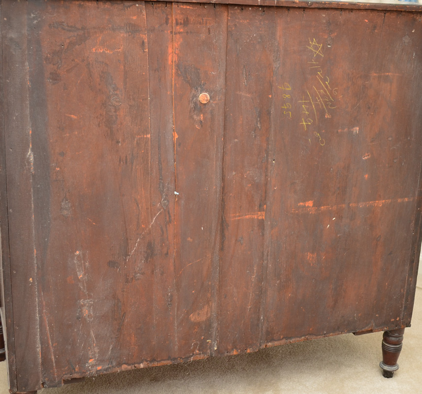 EARLY SHERATON COOKIE CORNER CHEST: Bowed front 2 over 3 drawer with turned 3/4 column styles. 42 1/4'' h. x 45 1/2'' x 22 1/2''.