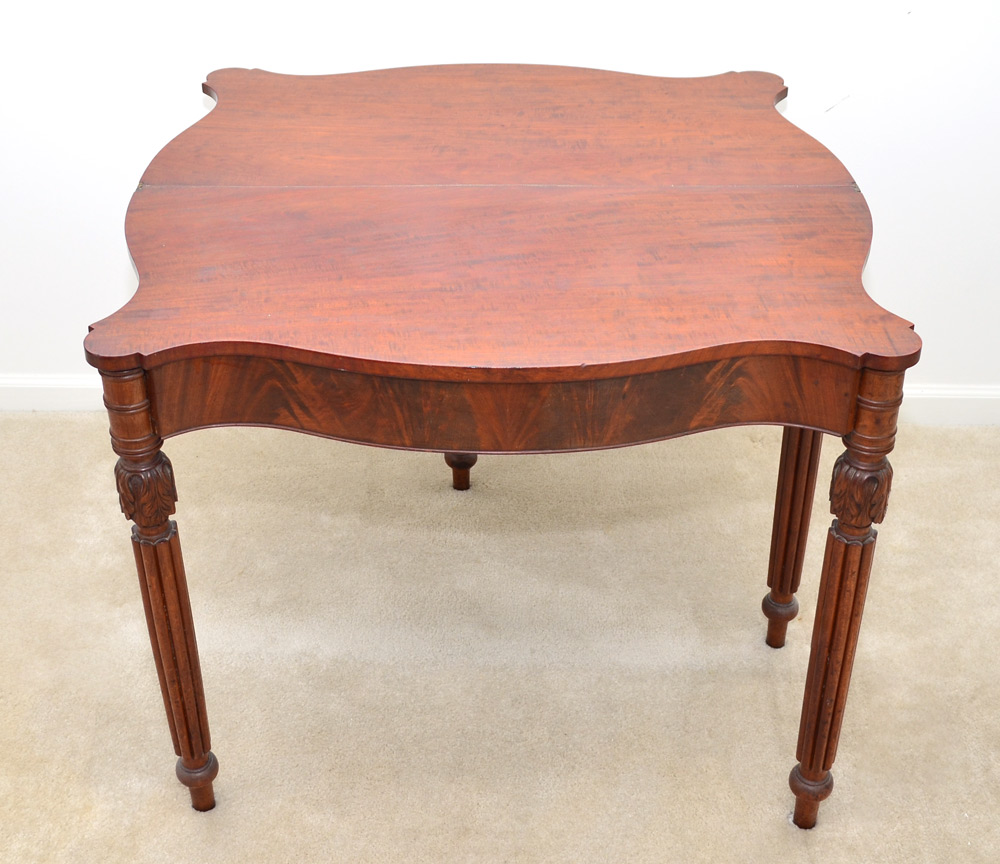 CARVED MAHOGANY CARD / GAME TABLE: Flip top with shaped edge and corners, shaped apron. Fluted legs with carved acanthus leaf accents. Overall measures 30 1/2'' h. x 35 1/2'' x 19''.