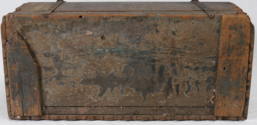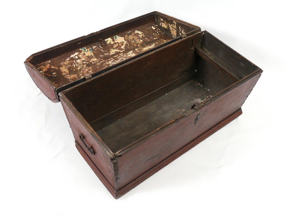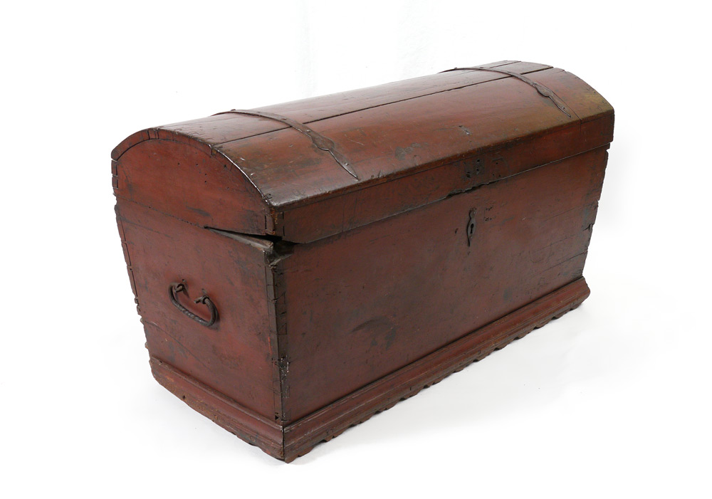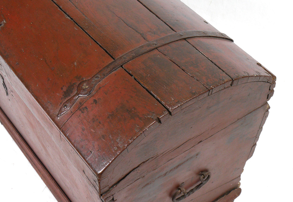 18TH CENTURY DOMED BLANKET CHEST: Red paint decorated, hinged domed lid, iron straps and hardware. 24 3/4'' h. x 43 1/2'' x 21 1/2''.