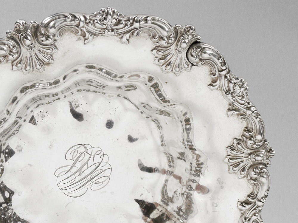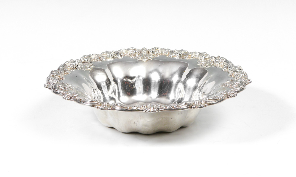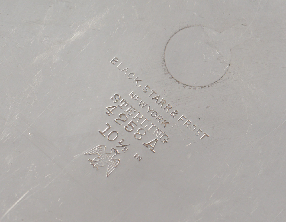 BLACK, STARR & FROST EMBOSSED STERLING SERVING BOWL: Embossed rim with rococo foliate scroll, fluted body, monogrammed center. Marked on base Black, Starr & Frost, New York, Sterling, 4258A, 10 1/2 In. Measures 2 1/2'' h. x 10 3/4'', approx. 12.8 troy oz.