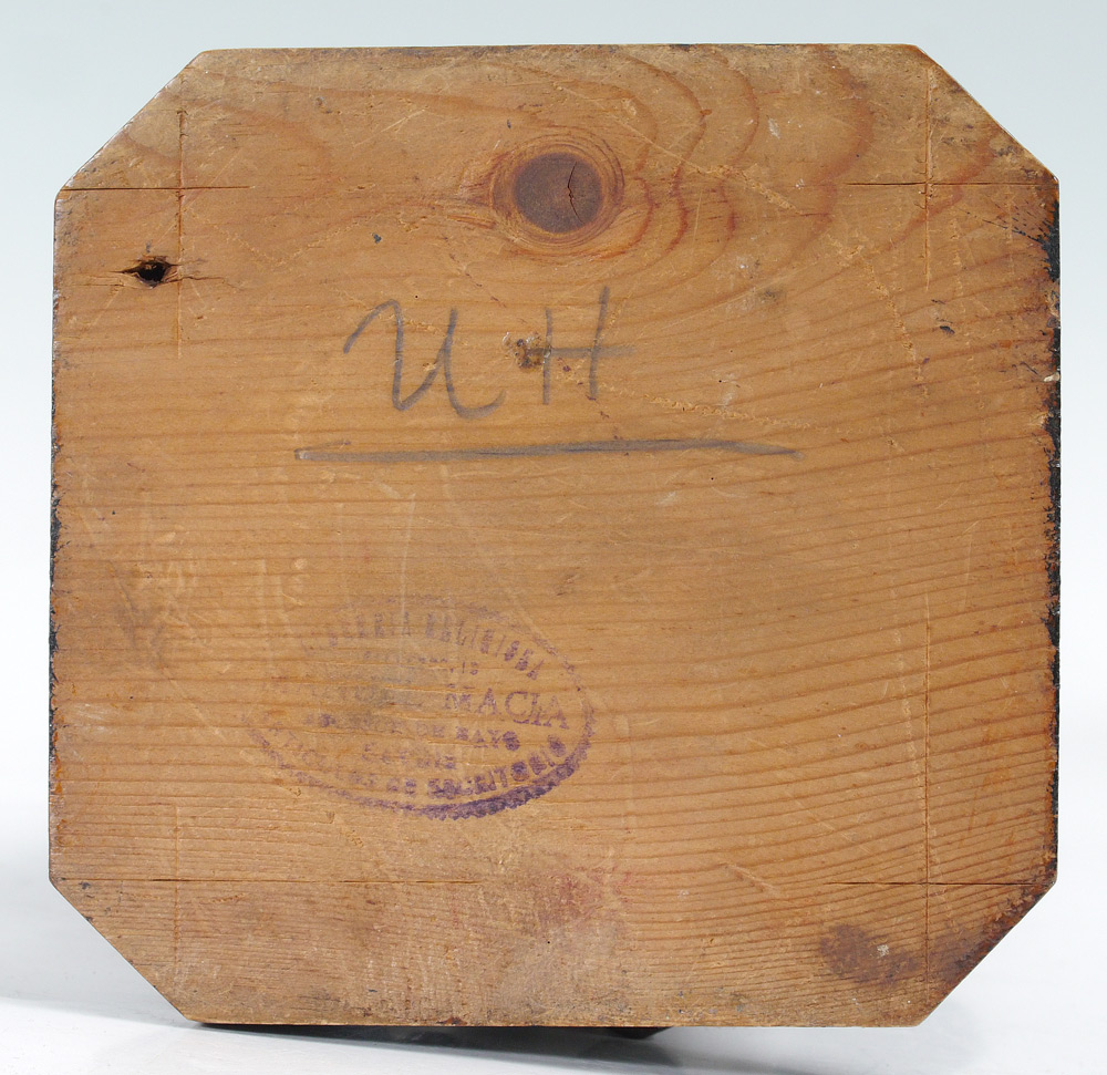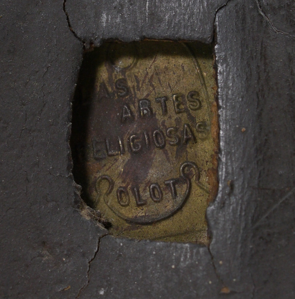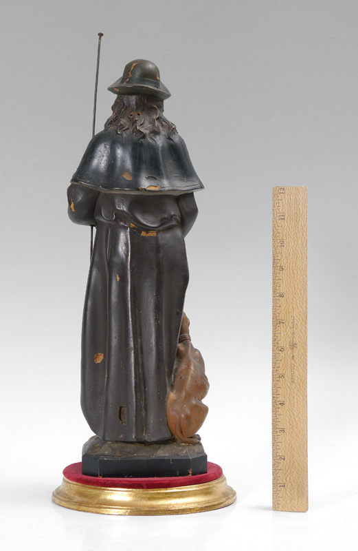 SMALL STATUE OF ST. ROCCO BY LAS ARTES RELIGIOSAS OLOT: 16 3/8'' h., with beveled gilt wood pedestal, stamp verso ''Las Artes Religiosas Olot''. The religious imagery workshop Las Artes Religiosas was founded in Olot Spain approx. 1902.