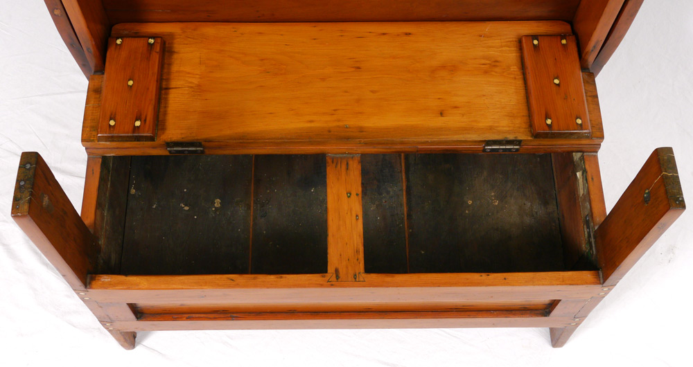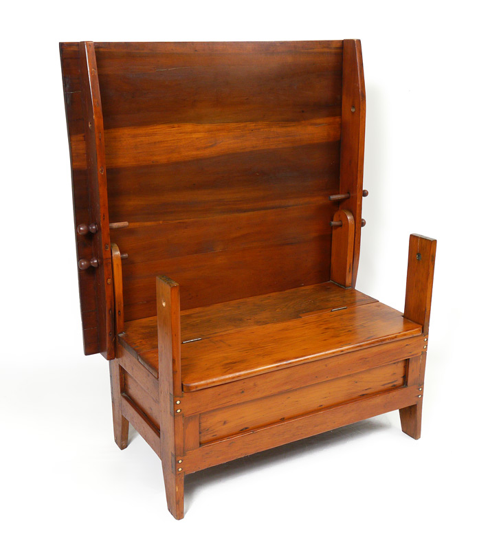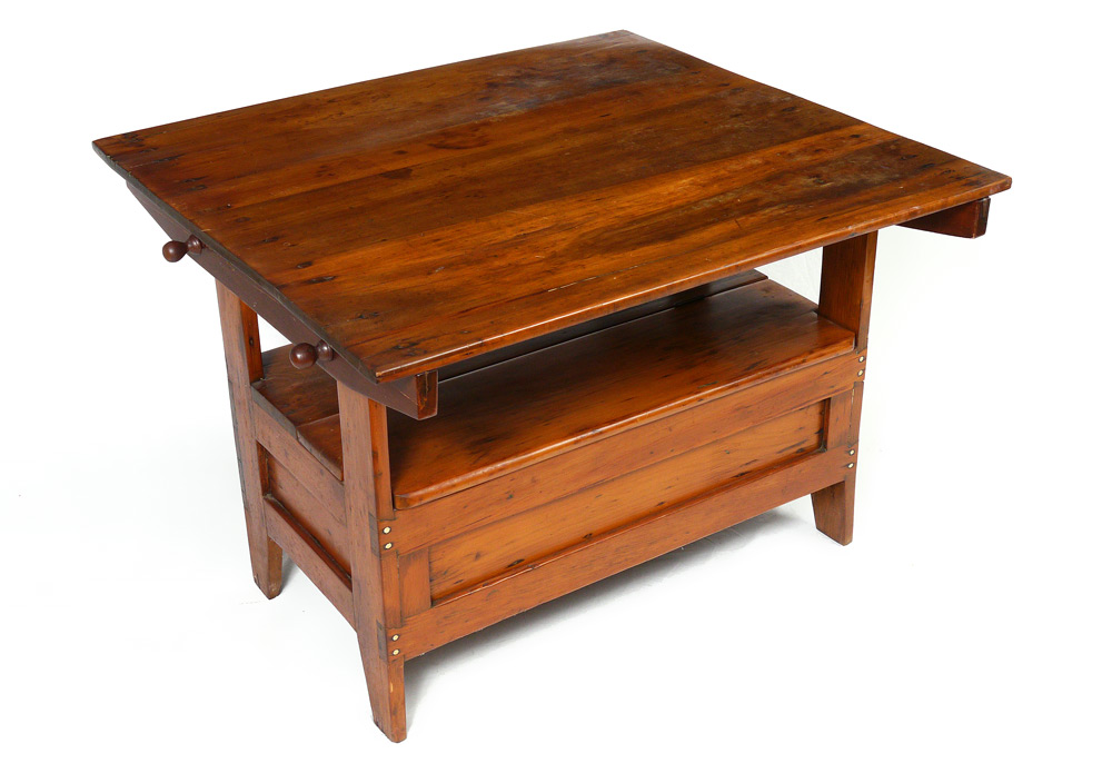 19TH CENTURY AMERICAN COUNTRY CHAIR TABLE: Converts from chair to table and back again. In table position, measure 29'' h. x 41 3/4'' x 37 1/2''.