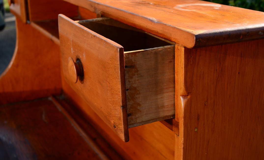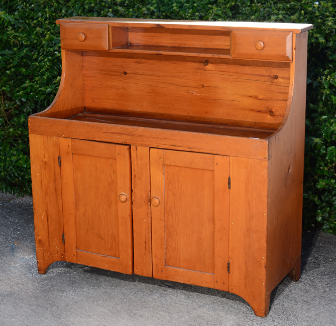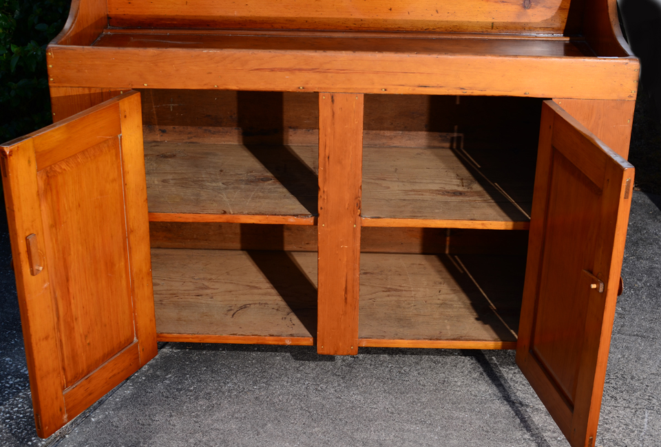 19TH CENTURY PINE DRY SINK: Top with open shelf surmounted by 2 drawers over recessed well over 2 doors, shaped feet. Measures 51 3/4'' h. x 53'' x 20 3/4''.
