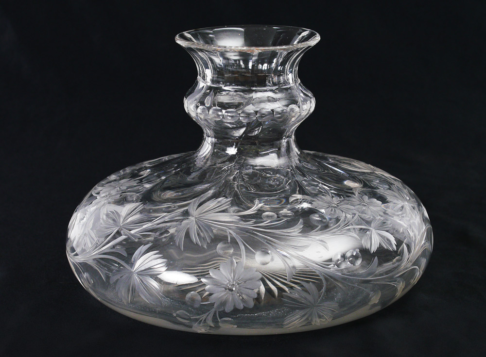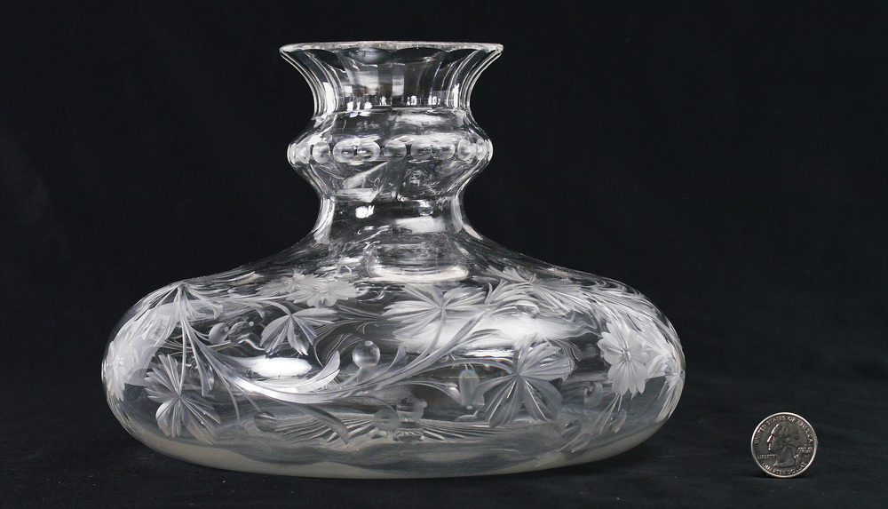 WEBB FLORAL CUT GLASS VASE: Squat vase with cut glass floral motif, signed Webb. Measures 6 1/2'' h. x 9''.
