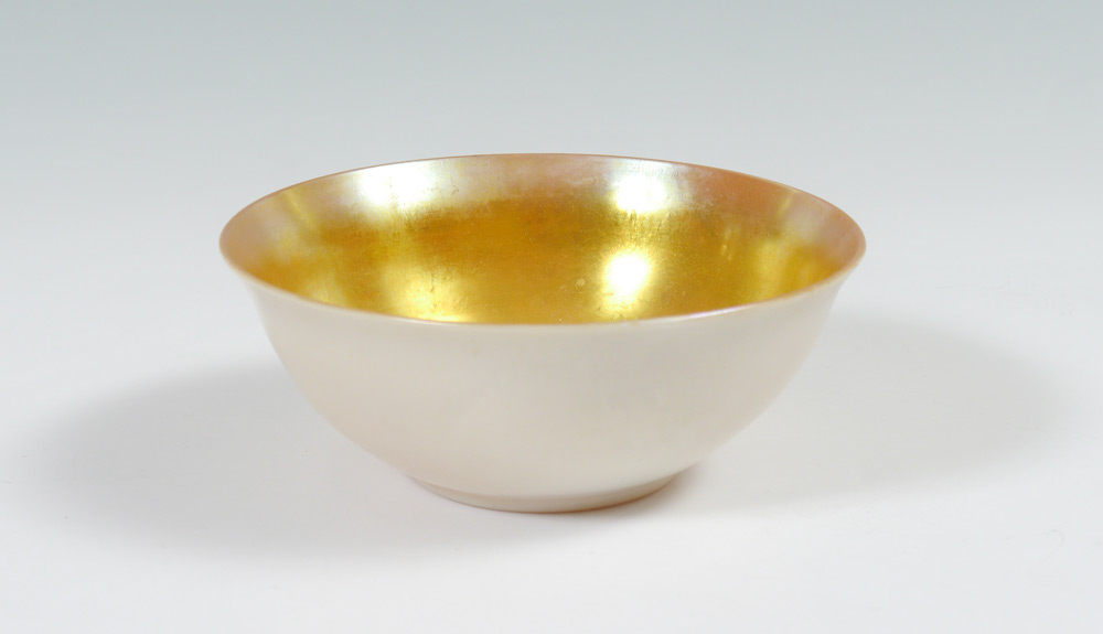 STEUBEN CALCITE & GOLD AURENE BOWL: Unmarked, gold aurene interior, 2 1/8'' h. x 5 1/2''.