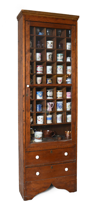 SHAVING MUG DISPLAY CABINET: 40 individual mug compartments behind glass front door, over 2 drawers, shaped skirt. Measures 80 1/4''h. x 26'' x 8 3/4''.