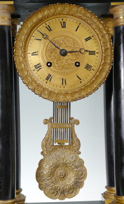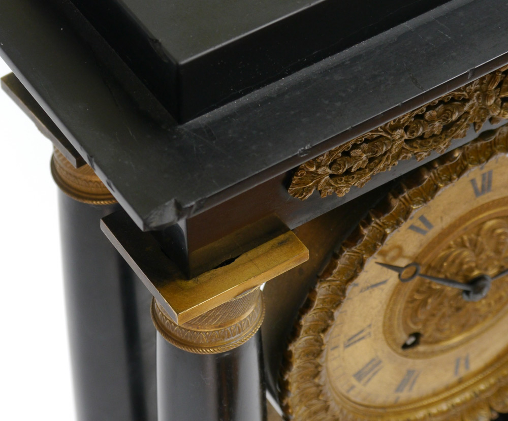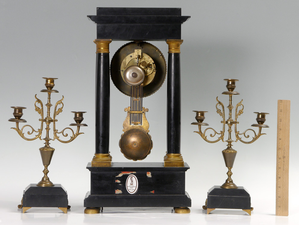CONTINENTAL BLACK PORTICO CLOCK & GARNITURE: Portico clock with black slate body, applied ormolu decoration, brass dial with Roman numerals. European time and strike movement, embossed pendulum. 21 1/4'' h. x 11'' x 6''. Sold with 3 light candelabra garniture set, 14'' h. x 8 1/4''.