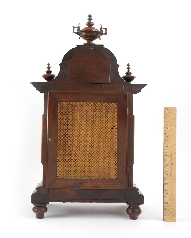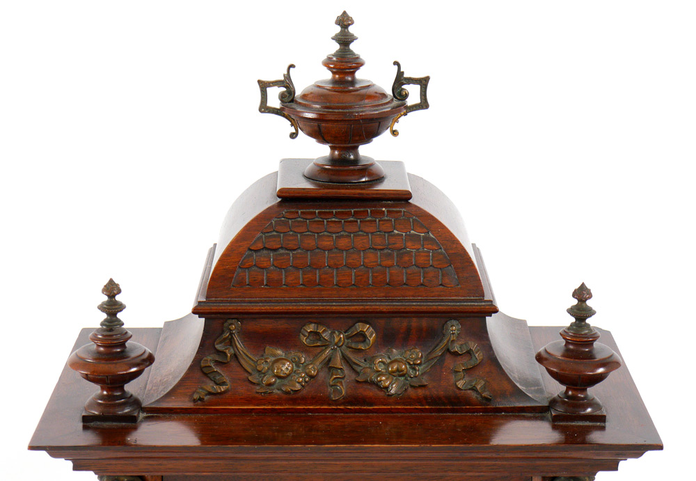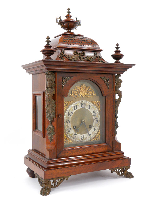 JUNGHANS CARVED MANTLE CLOCK: Late 19th to early 20th century, carved walnut case, center urn finial and 2 spire finials. Body with applied bronze figural decoration, bronze paw front feet. Mixed metal dial with applied gilt decoration, silvered chapter ring with Arabic numerals. Junghans marked time and dual gong strike movement, strikes on the quarter hour. Overall measures 22 1/4'' h. x 12'' x 8''.