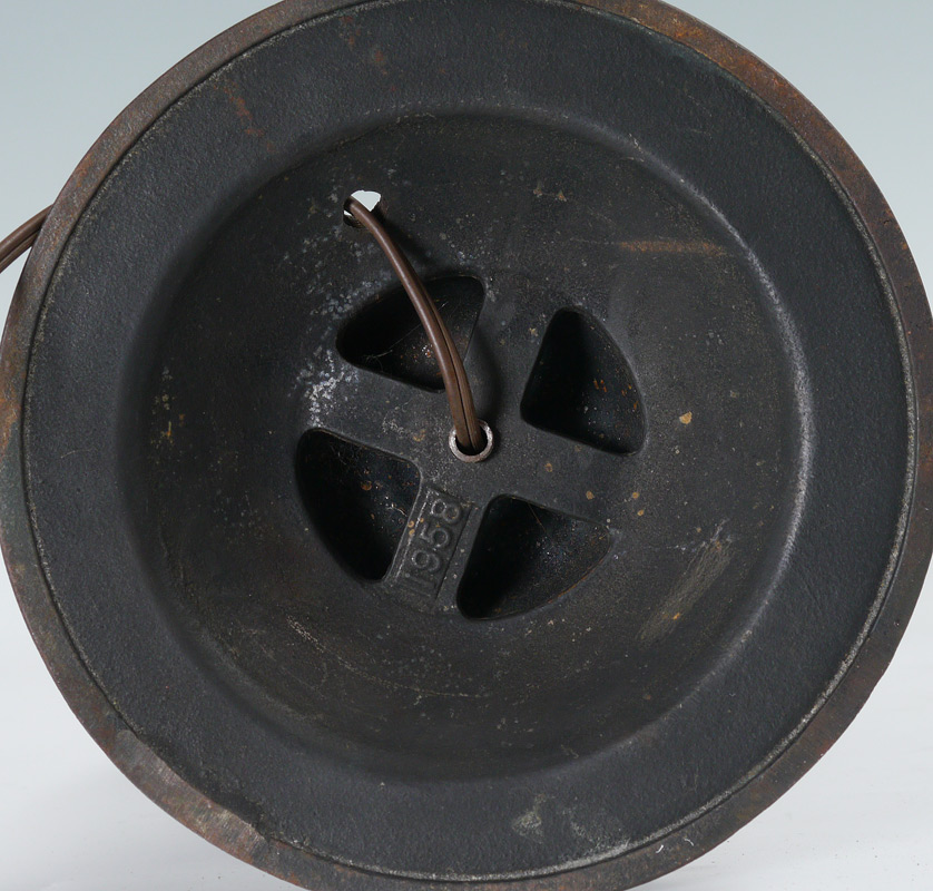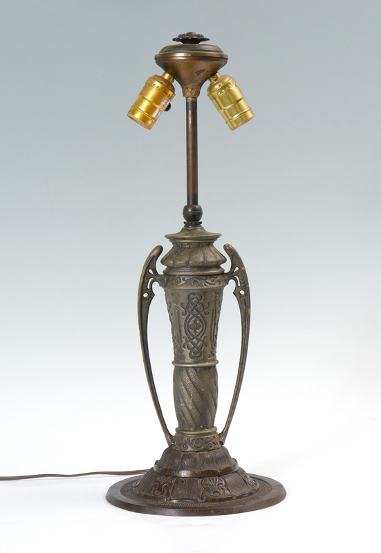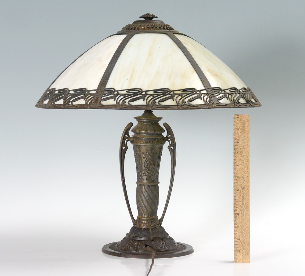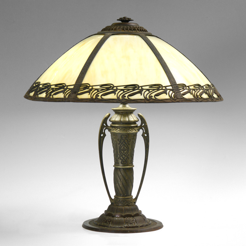 6 BENT PANEL SLAG GLASS TABLE LAMP: 6 caramel slag glass bent panel shade, filigree shade with art nouveau lines and flowers rim. Patinated cast metal handled base marked 1958, double socket fixture. Shade 7 1/8'' h. x 19 1/4'', base 20 1/4'' h. x 8''.