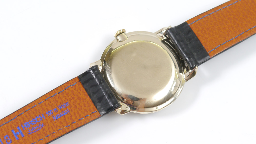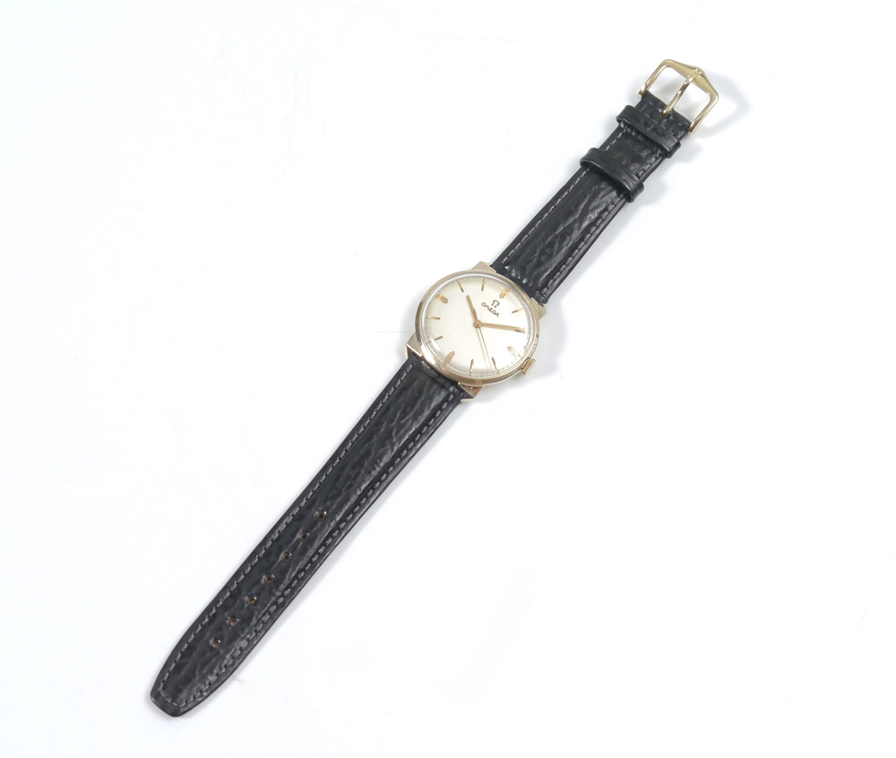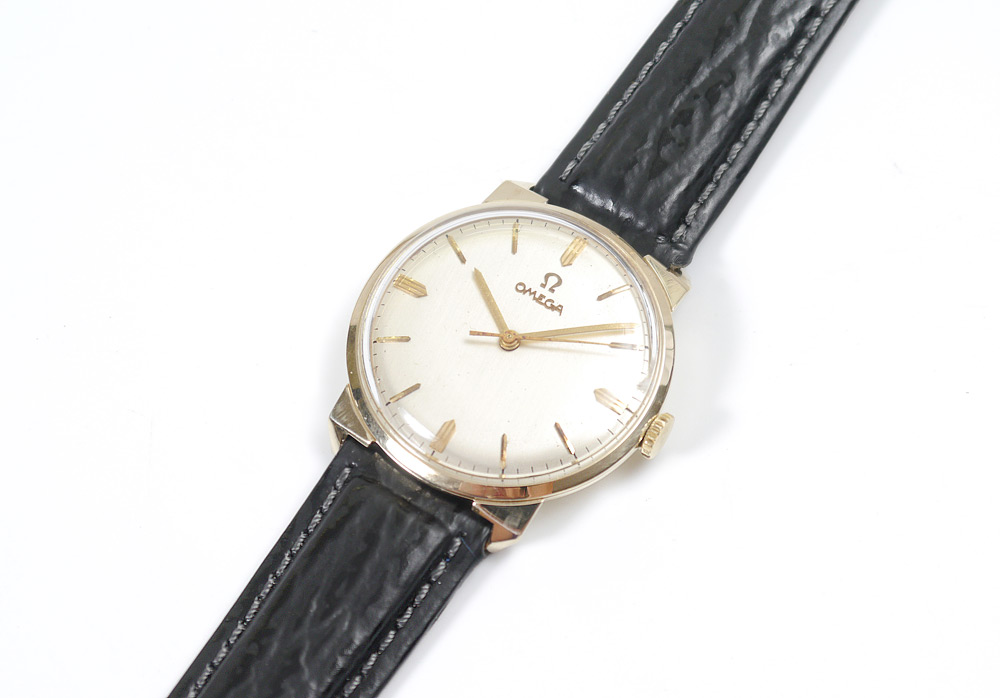 14K GOLD OMEGA WRISTWATCH: Classic round dial with bar markers and sweeping second hand. Mechanical movement in good working order. Art Deco lugs. Brand new Hirsch leather band. Length 9'' overall. Weight of case is 12.8 grams.