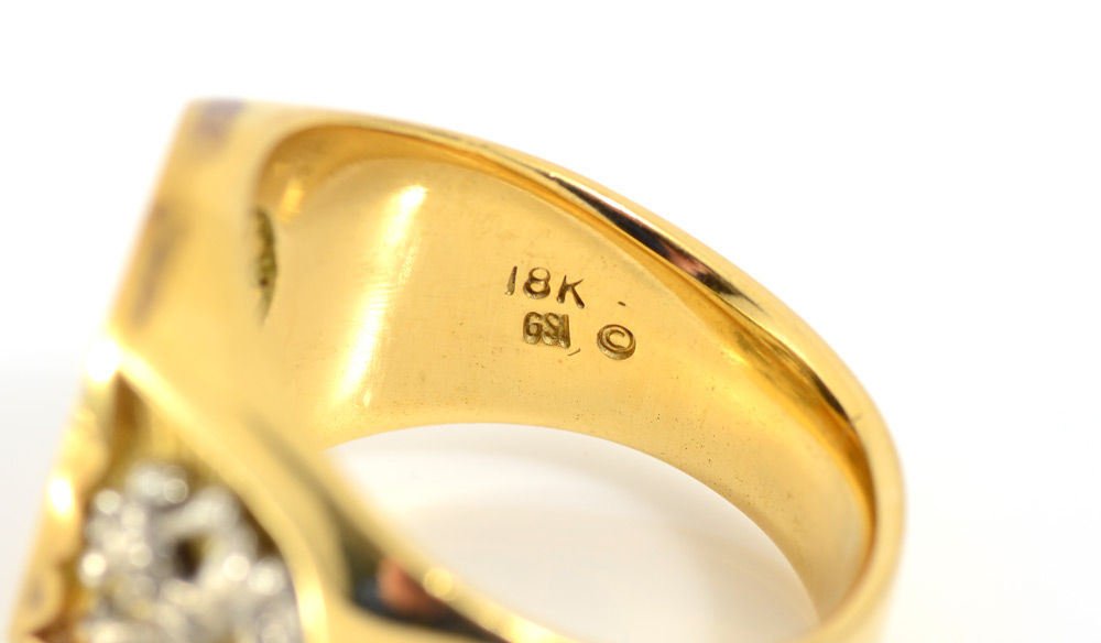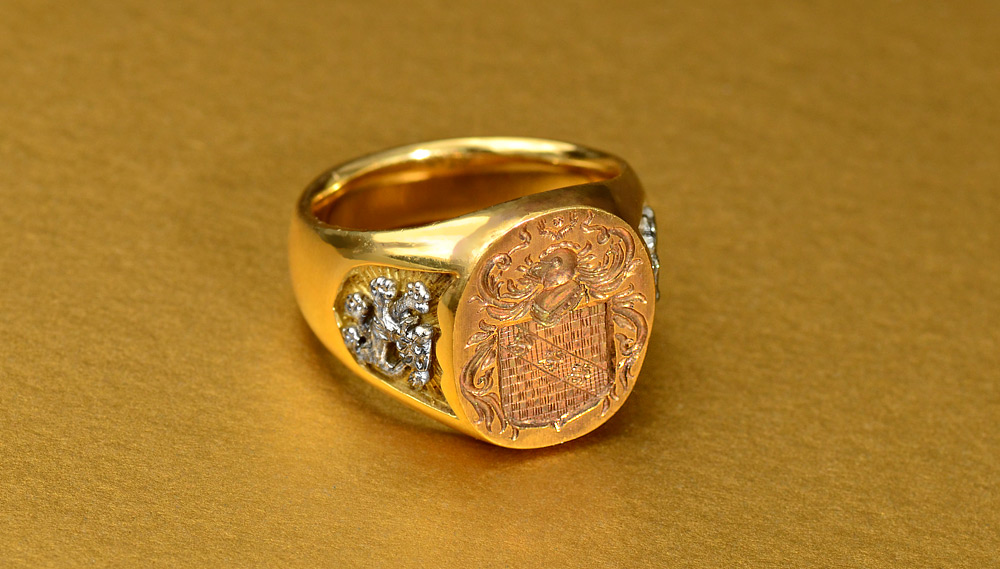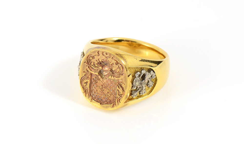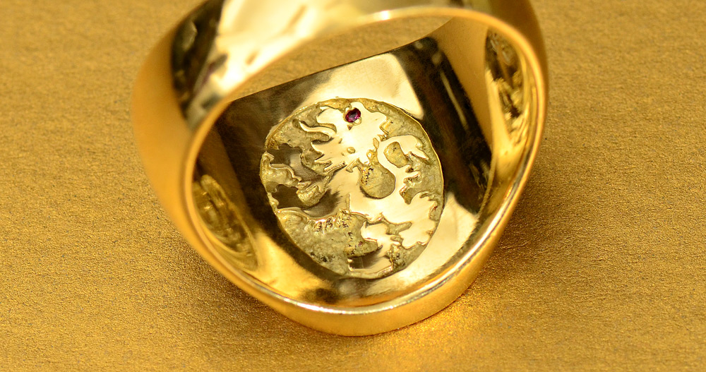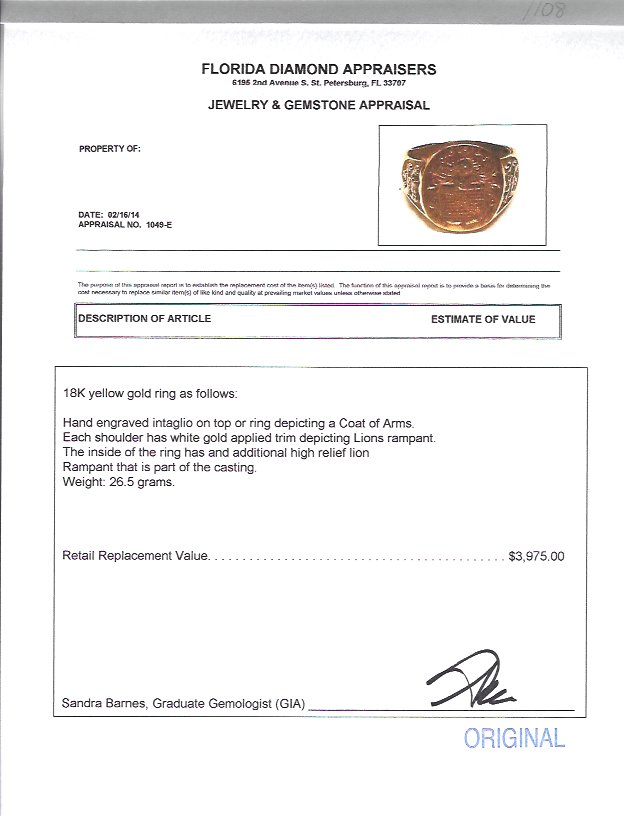 18K INTAGLIO COAT OF ARMS MAN'S RING: 18k yellow gold ring centering a hand engraved intaglio depicting a coat of arms. Applied on the shoulders are two white gold lions rampant. Note the detail in the casting of a lion rampant on the interior of the ring. Size 11. Weight 26.5 grams. Sold with current Florida Diamond Appraisers GIA graduates appraisal for $3,975.