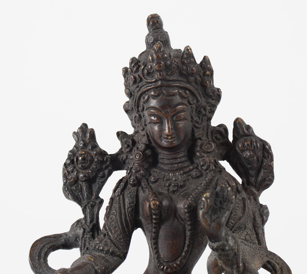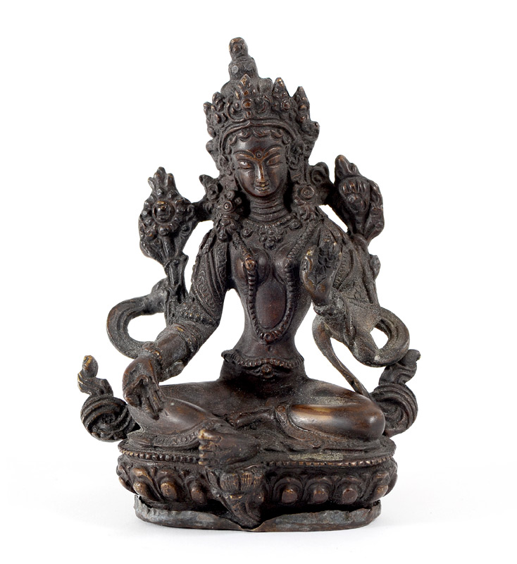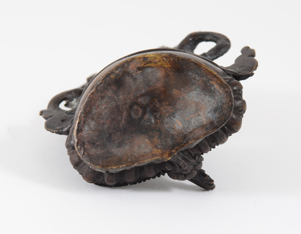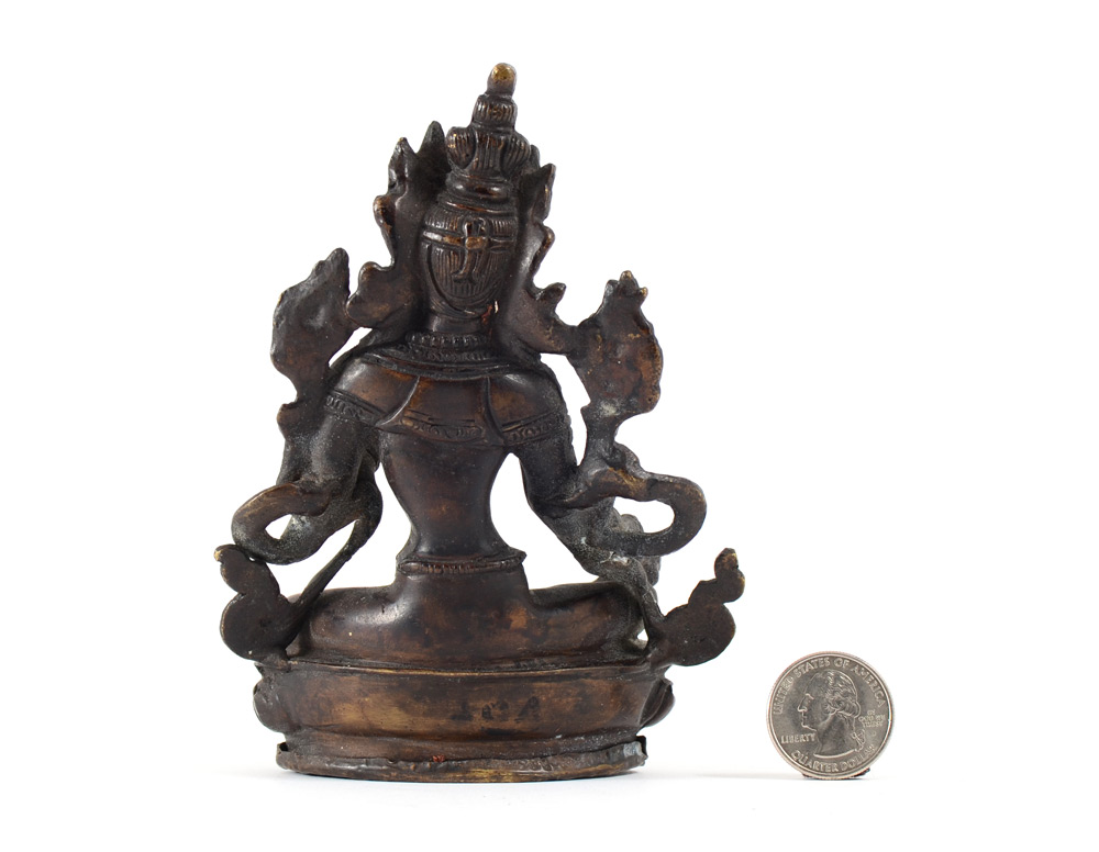 BRONZE SEATED BUDDHA: Figure of a seated Buddha on lotus throne, hands in mudra. Marked base is very loose and may have been opened before, overall measures 5 1/4'' h. x 4'' x 2 3/4''. Actual age unknown.