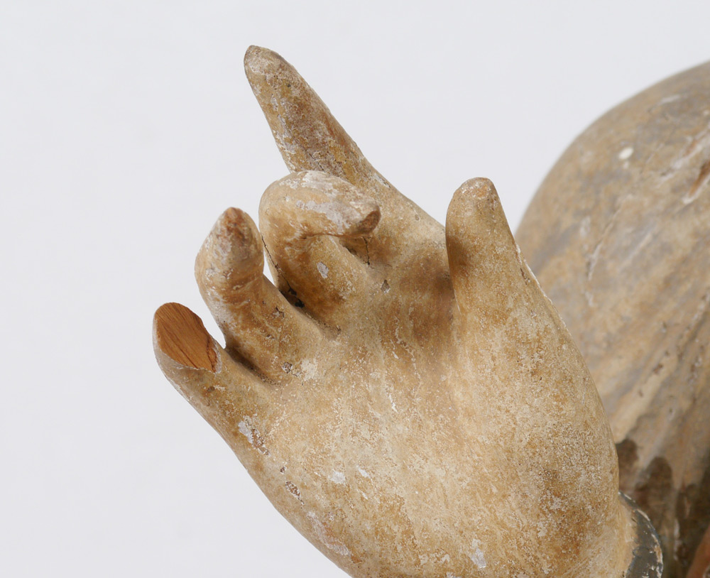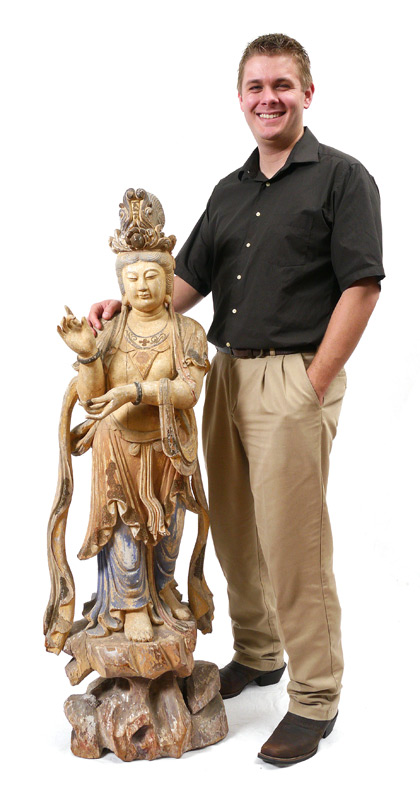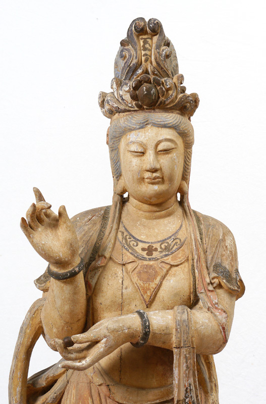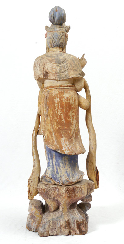 LIFE SIZE CARVED WOOD QUAN YIN: With flowing robes and polychrome paint decoration remaining. Actual age unknown. 57 1/2'' h. x 20'' w. x 13''