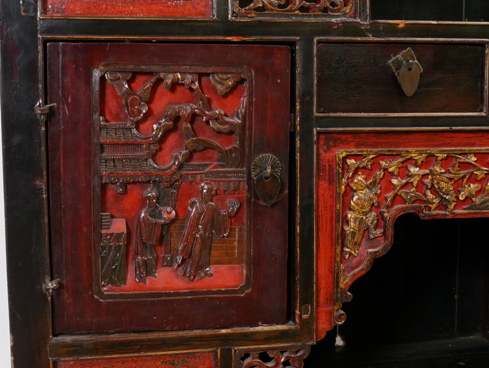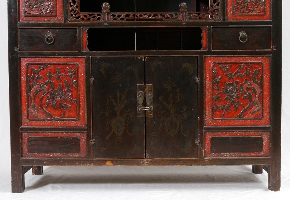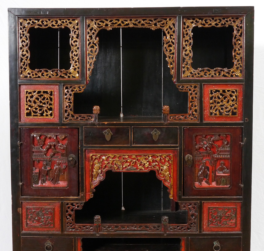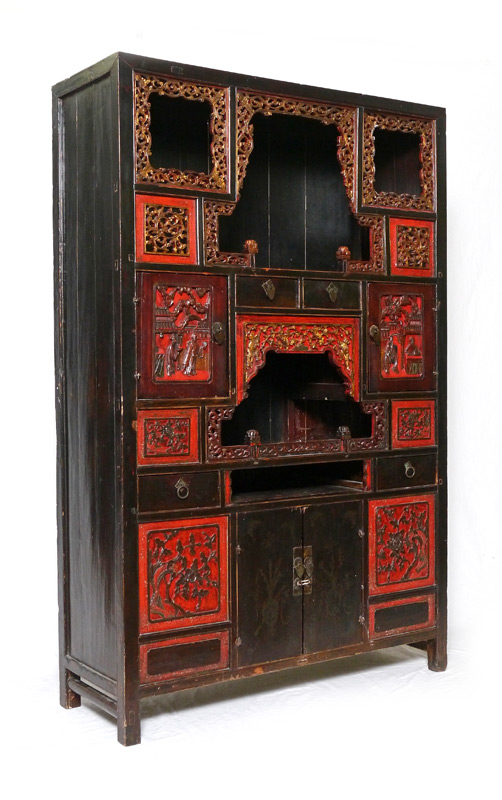 CARVED CHINESE CABINET / ETAGERE: Red and black lacquer, gilt accents, with pierced and carved decoration. 4 doors and 4 drawers with several open compartments. Overall measures 65 1/2'' h. x 41 3/4'' x 15 1/2''.