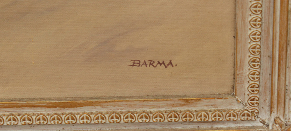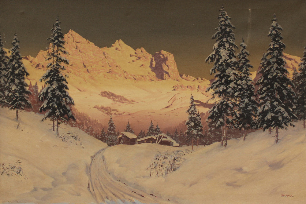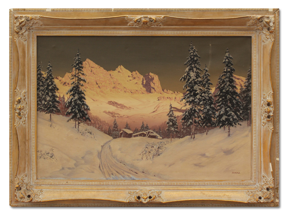 BARMA, Hans, (German-Austrian, 1903-1987): Snowy Sunlit Peaks with Chateau & Pines, Oil/Canvas, 24'' x 36'', signed lower right, encased in original carved and painted frame with wear and missing pieces of the frame 33'' x 45''.