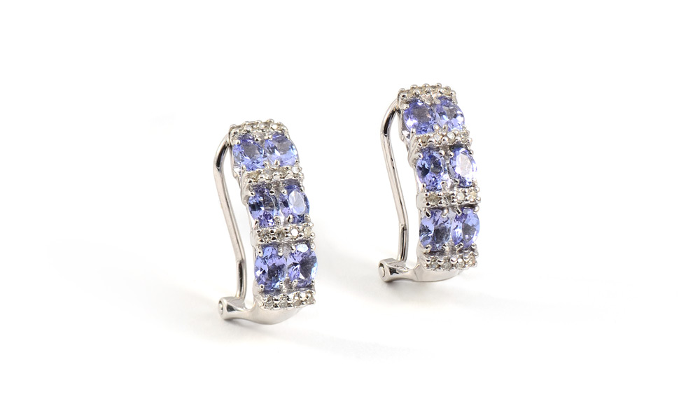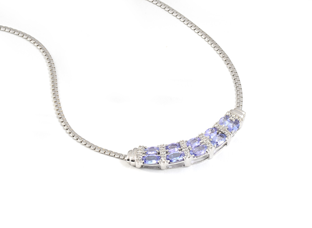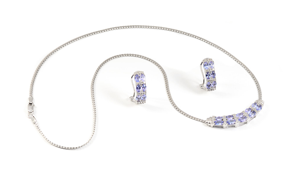 TANZANITE AND DIAMOND NECKLACE AND EARRINGS: 14k white gold set contains 2 oval tanzanite totaling approx. 6 Ct. The round accent diamonds total approx. 1.00 Ct. The integrated chain measures approx. 15''. Earrings have hinge clip closure. Weight 11.1 grams.