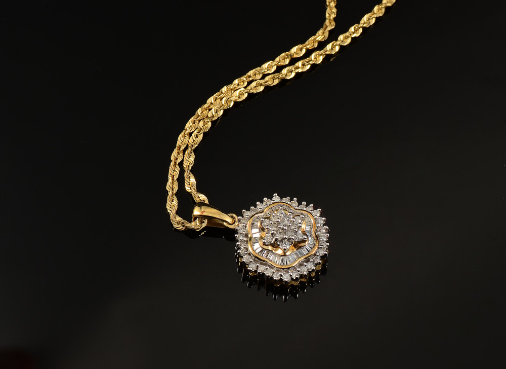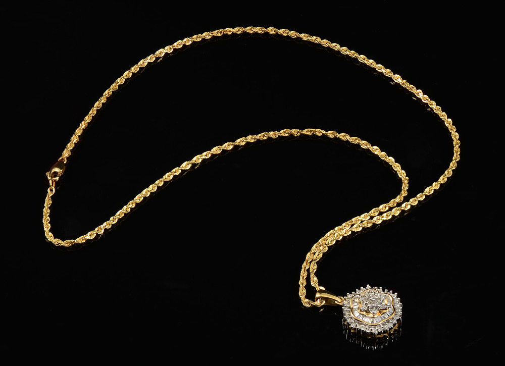 DIAMOND PENDANT NECKLACE: 10K yellow gold pendant with a showy display of round and baguette diamonds totaling approx. 1.00 Ct., rated I1-I2 in clarity and I-J color. The chain is 14K gold, 18''. Chain weight 6.1 grams. Pendant weight 4 grams.