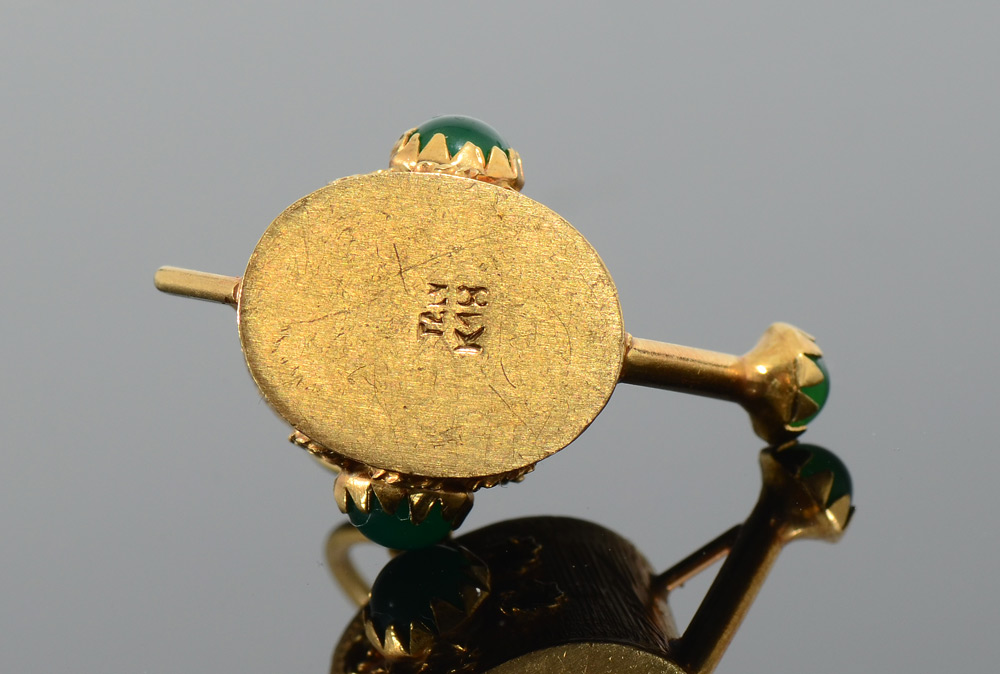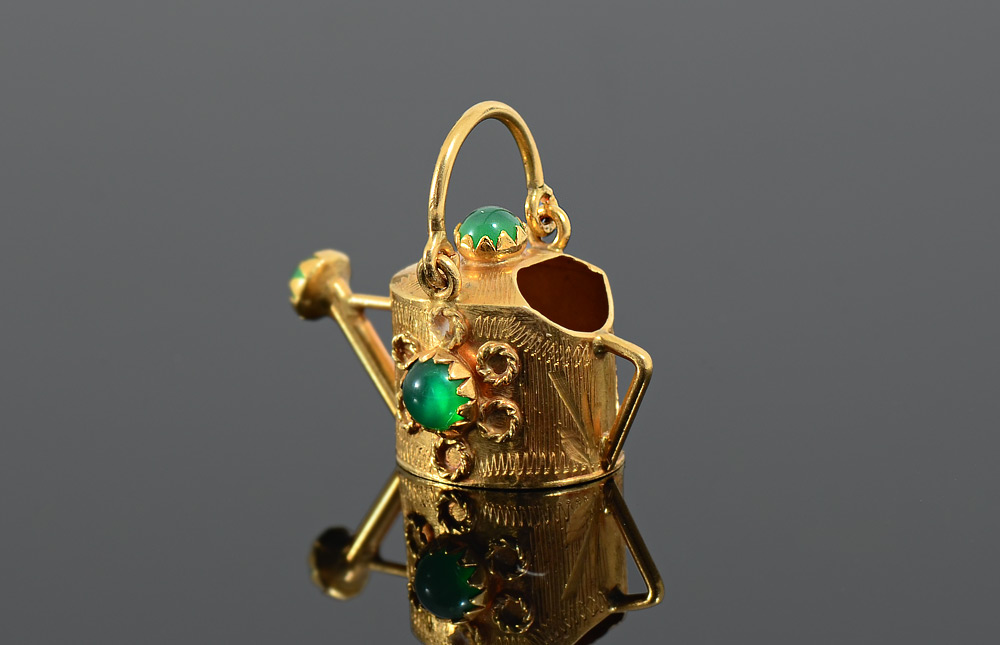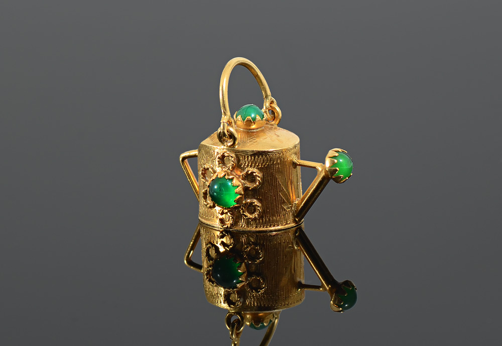 18K YELLOW GOLD WATERING CAN CHARM OR PENDANT: FInely detailed watering can with 4 chrysophase cabochons. Weight 5.9 gram