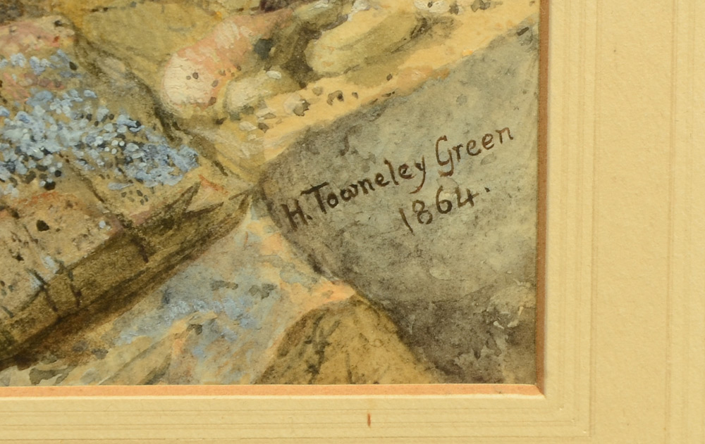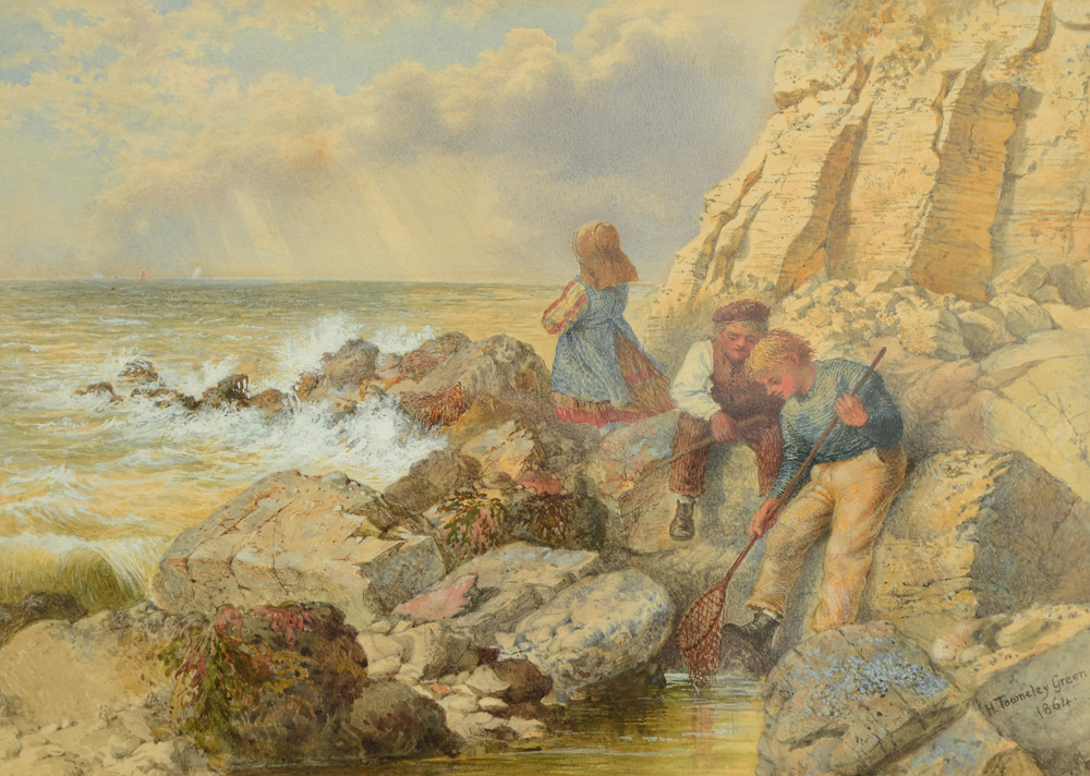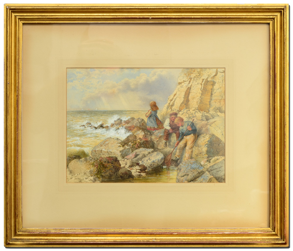 GREEN, Henry Townley, (British, 1836-1899): Children Playing by the Sea, Watercolor, Sight size 7'' x 9 7/8'', signed lower right, dated 1864, encased in a fine gilded frame with minor wear 15'' x 17 3/4''.