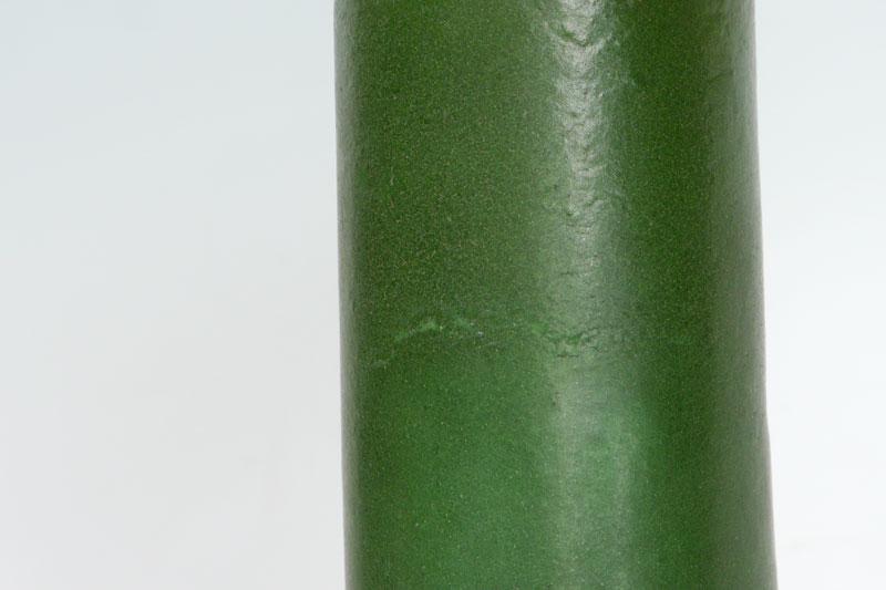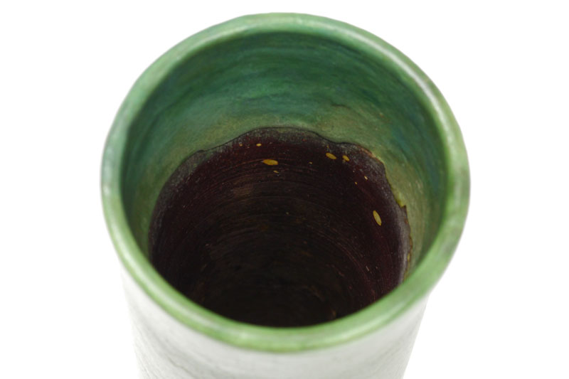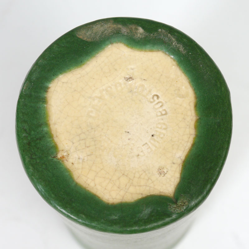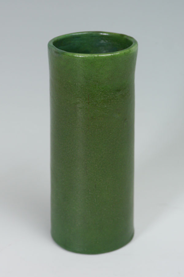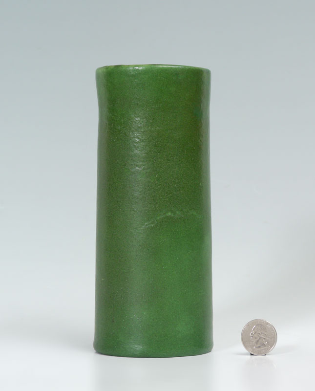 GRUEBY ART POTTERY CYLINDRICAL VASE: Slight flare to rim and taper to body, matte green glaze. Partial circular Grueby stamp on base. Overall 7 5/8'' h. x 3 1/4'' dia.